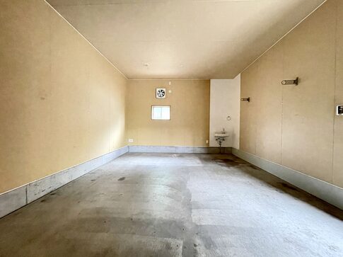 ガレージのサイズは間口が約3.7m 幅が約4m 奥行きは約5.7m 高さが低い所で約2.4m 高い所で約2.8m 使いやすい長方形のガレージは車両1台プラスアルファのサイズ感で バイクや自転車、工具箱などを置いても良さそうですね!