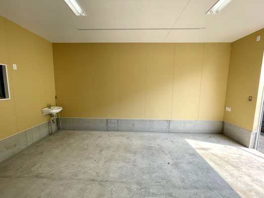 壁紙クロスも貼っていない剥き出しの石膏ボードが無骨な雰囲気のインナーガレージは