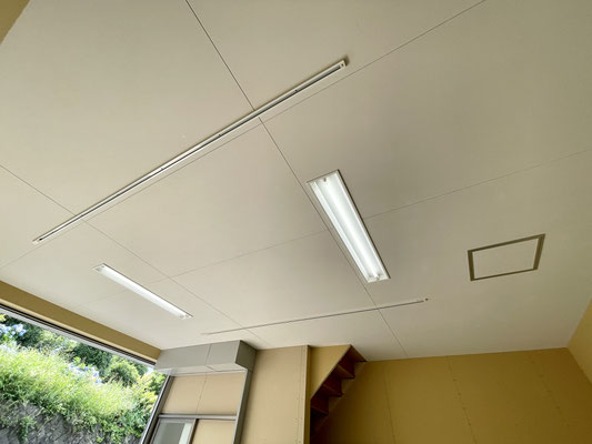 ガレージの天井には備え付けの照明器具とライティングレールが2本あります。