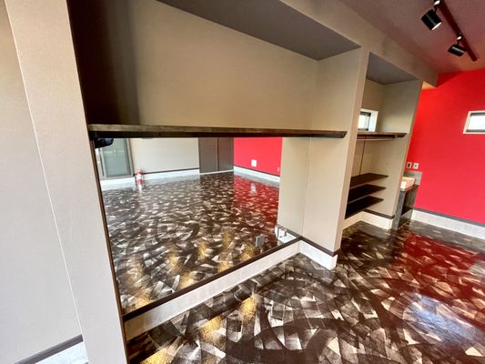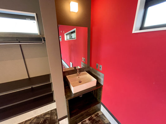 正面壁の赤だけではなく、左手側壁の鏡の仕様もニクい作り。