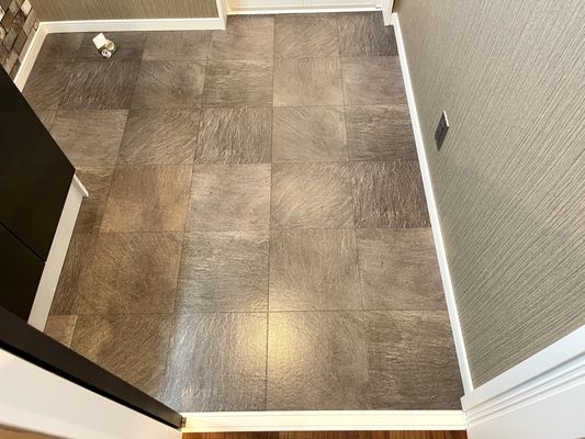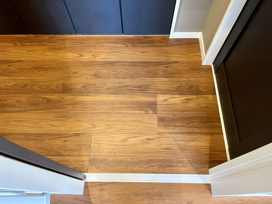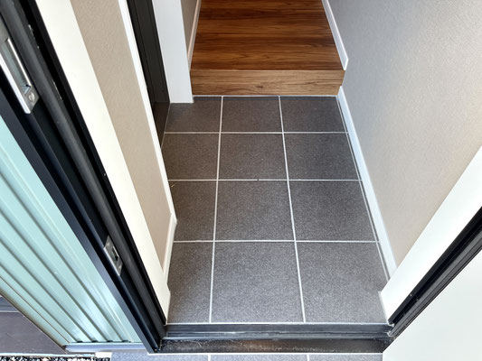 玄関土間は外部と続きのタイル張り、落ち着いた濃いめの色の木目の床ともマッチしています。