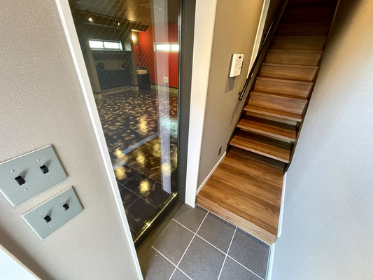 玄関入ってすぐ階段で2階の居住空間につながるタイプのガレージハウス。