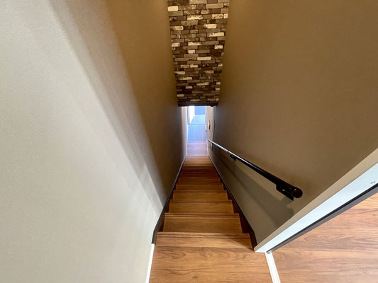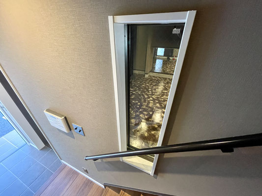 階段には手すりもついて安心な上、階段にもしっかりガレージを見る事が出来る窓が!
