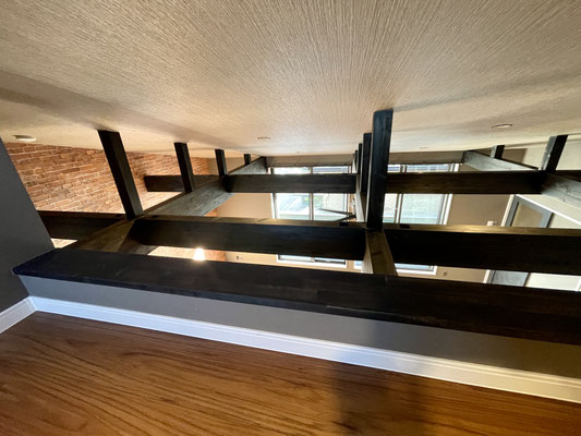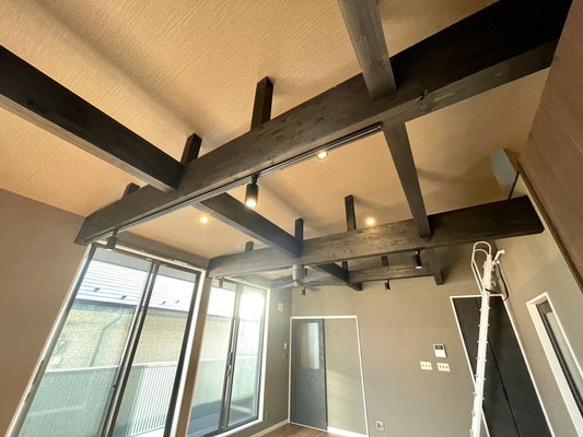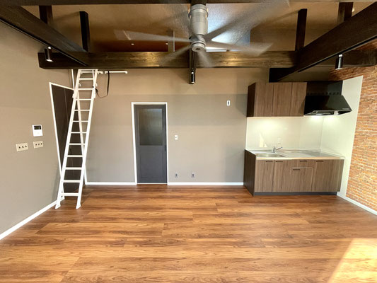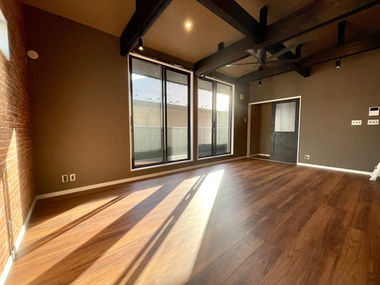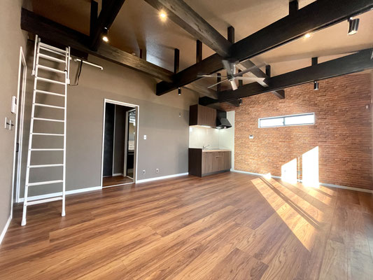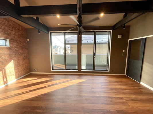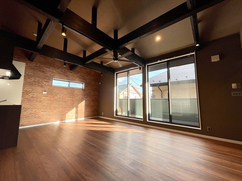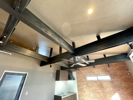 レンガ調の壁紙、黒く重厚で敢えて見せている梁と、高さのある天井、そして空気の循環のためのシーリングファン。