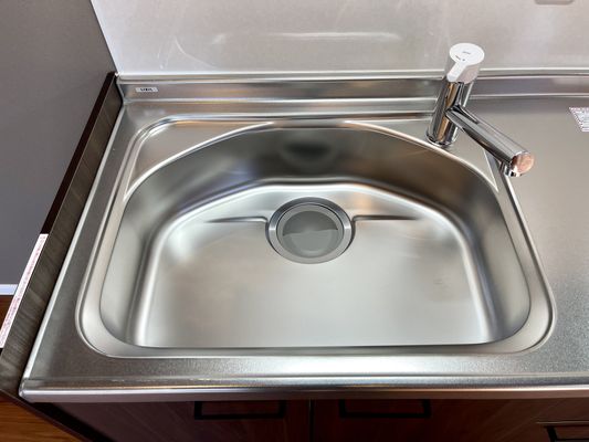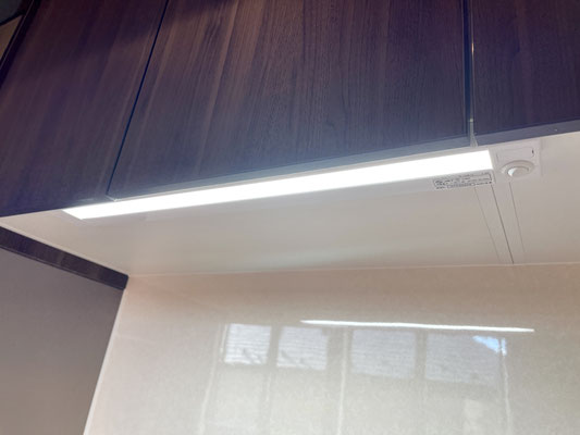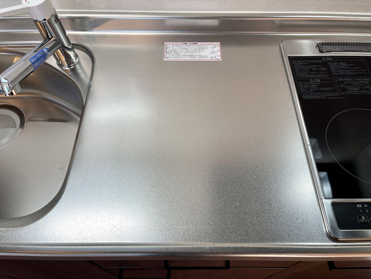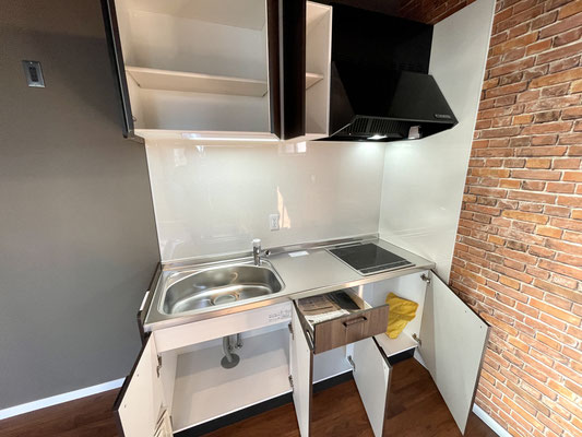 キッチンもお部屋に合わせたデザイン。IH2口で収納棚多めの物。