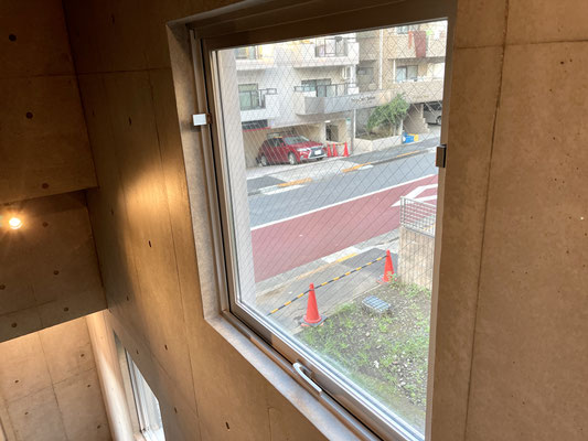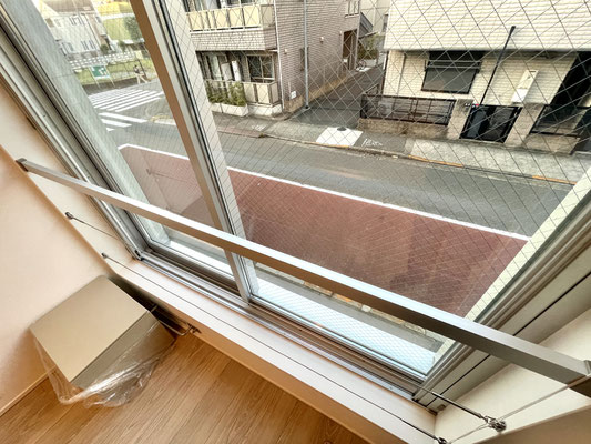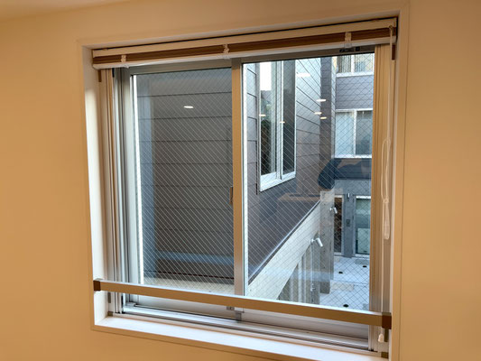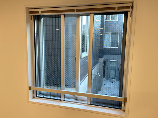 窓にはブラインドカーテンも付いているし、網戸はスッキリとした収納式。