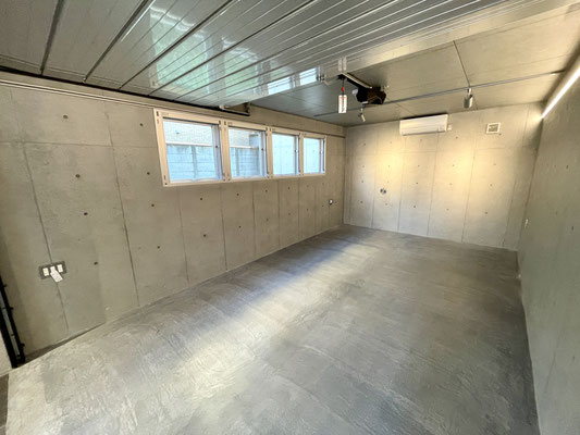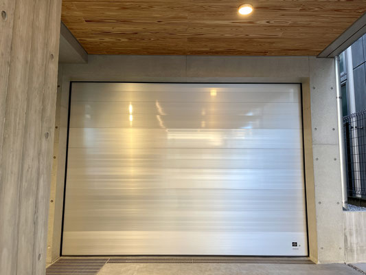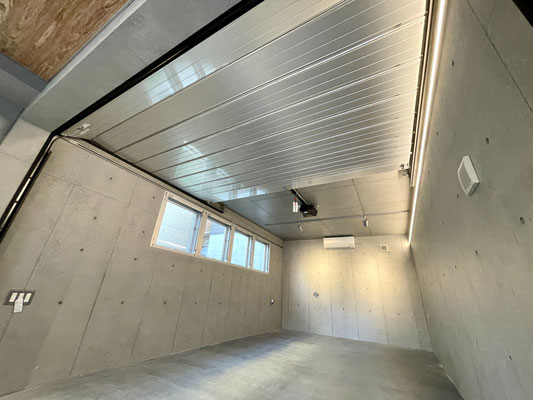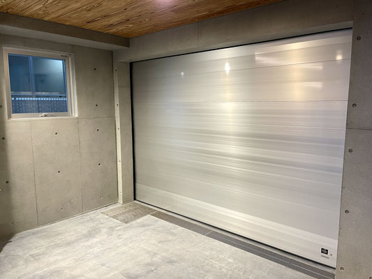シルバーのオーバースライドシャッターと剥き出しコンクリートがカッコいいね!!