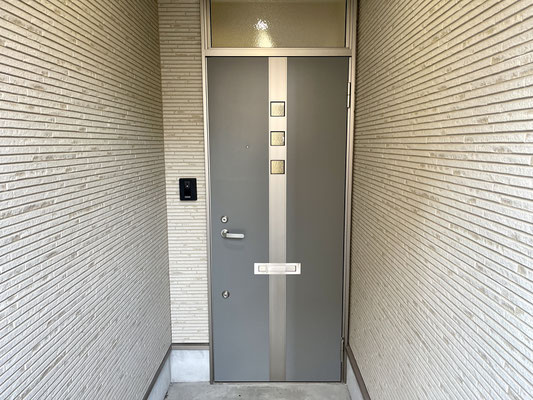 ガレージシャッターのすぐ隣に奥まった所が玄関ドア。