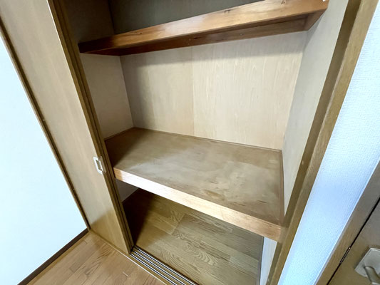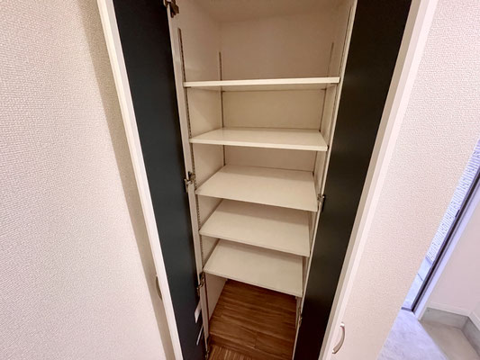 壁の多くを占める収納扉を開けると、奥行きもあるたっぷり収納スペース。