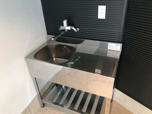 ガレージにあると嬉しい水回り。ステンレスのシンクが眩しいです。