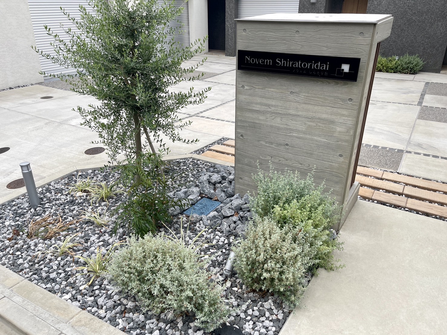 エントランス周りにはオリーブを中心とした植栽が配されていて、