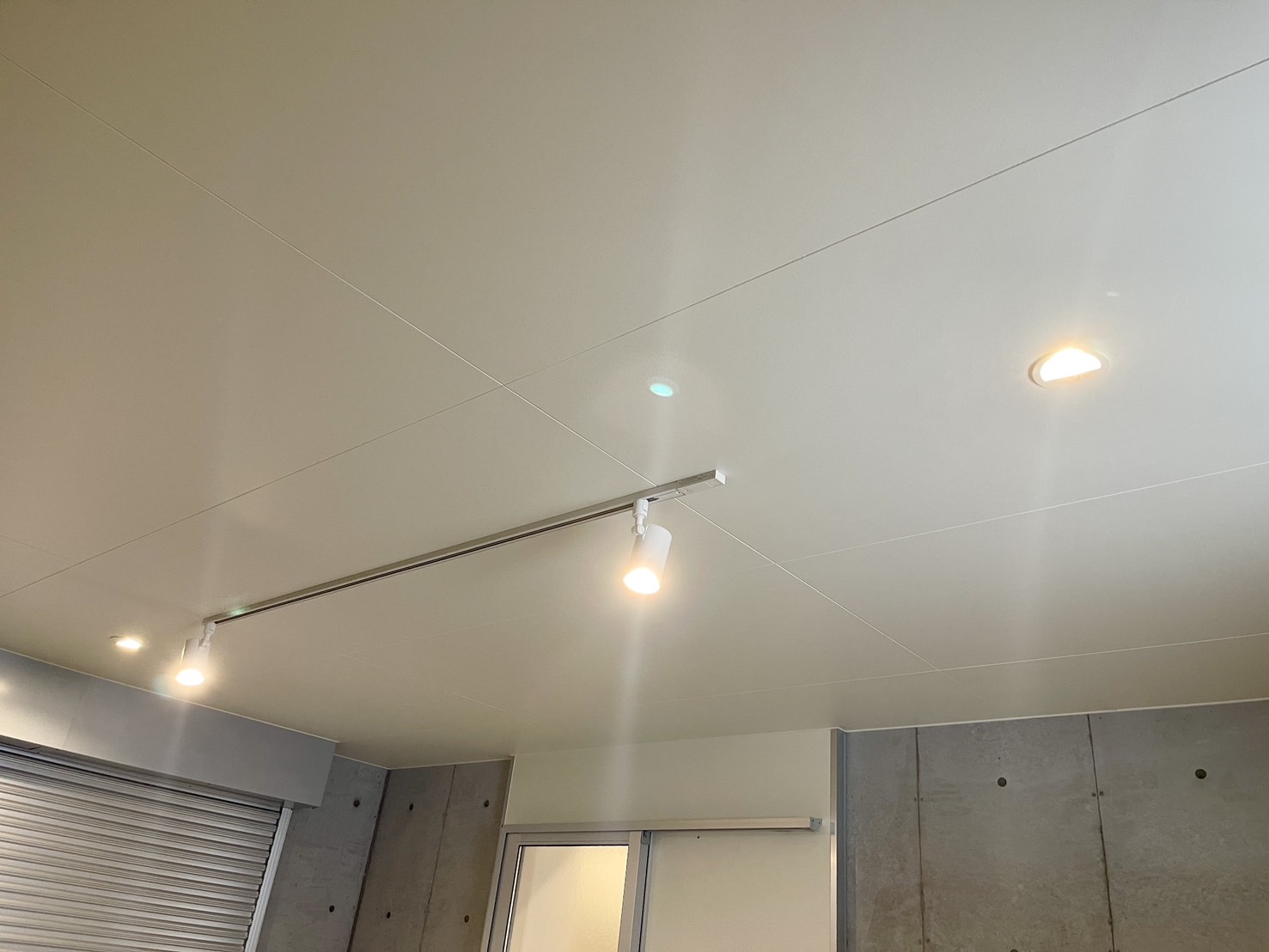 天井にはライトレールが設けられ、前後に配置された埋め込み型のダウンライトはセンサー式。