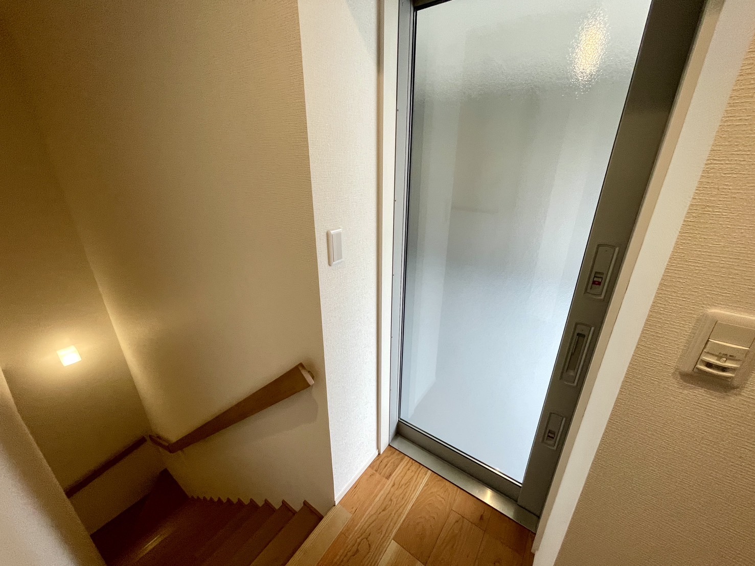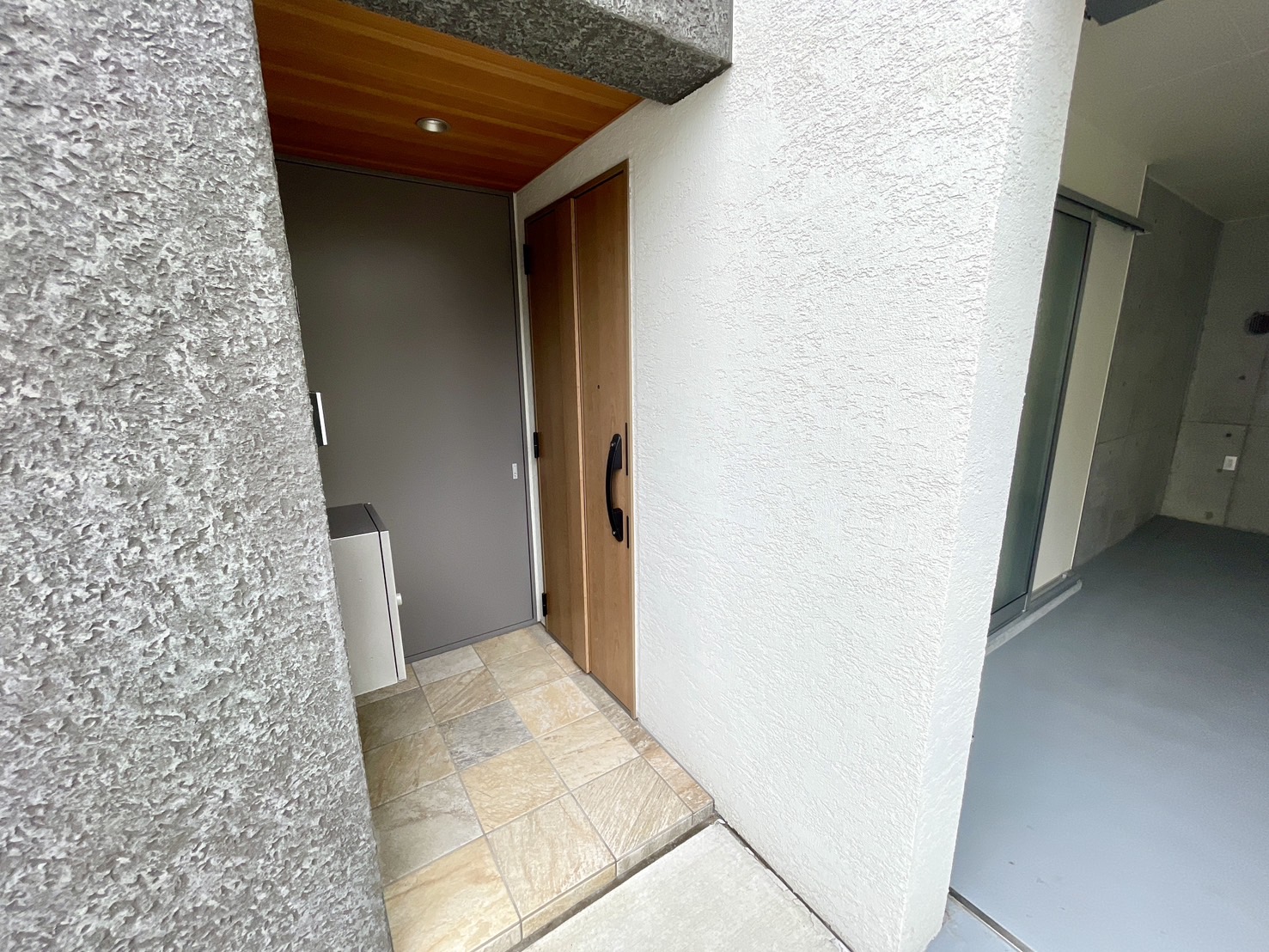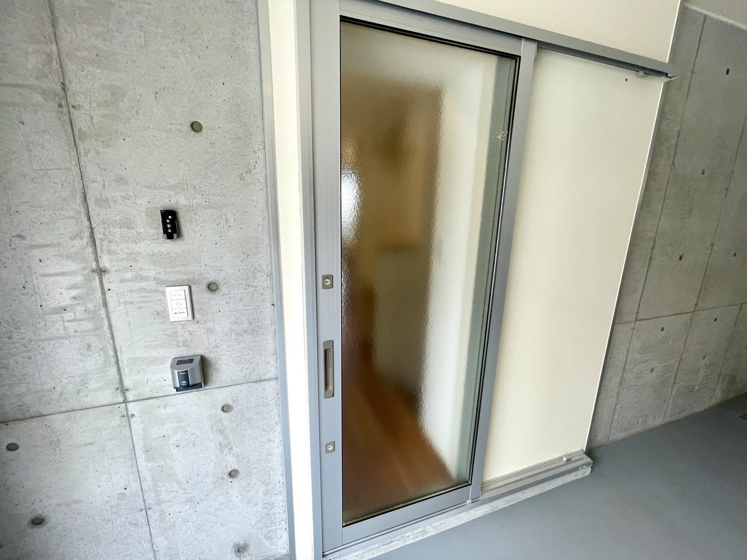 内部には玄関ホールへとつながるガラス製の鍵付きスライドドアを備え、採光と防犯性を両立。