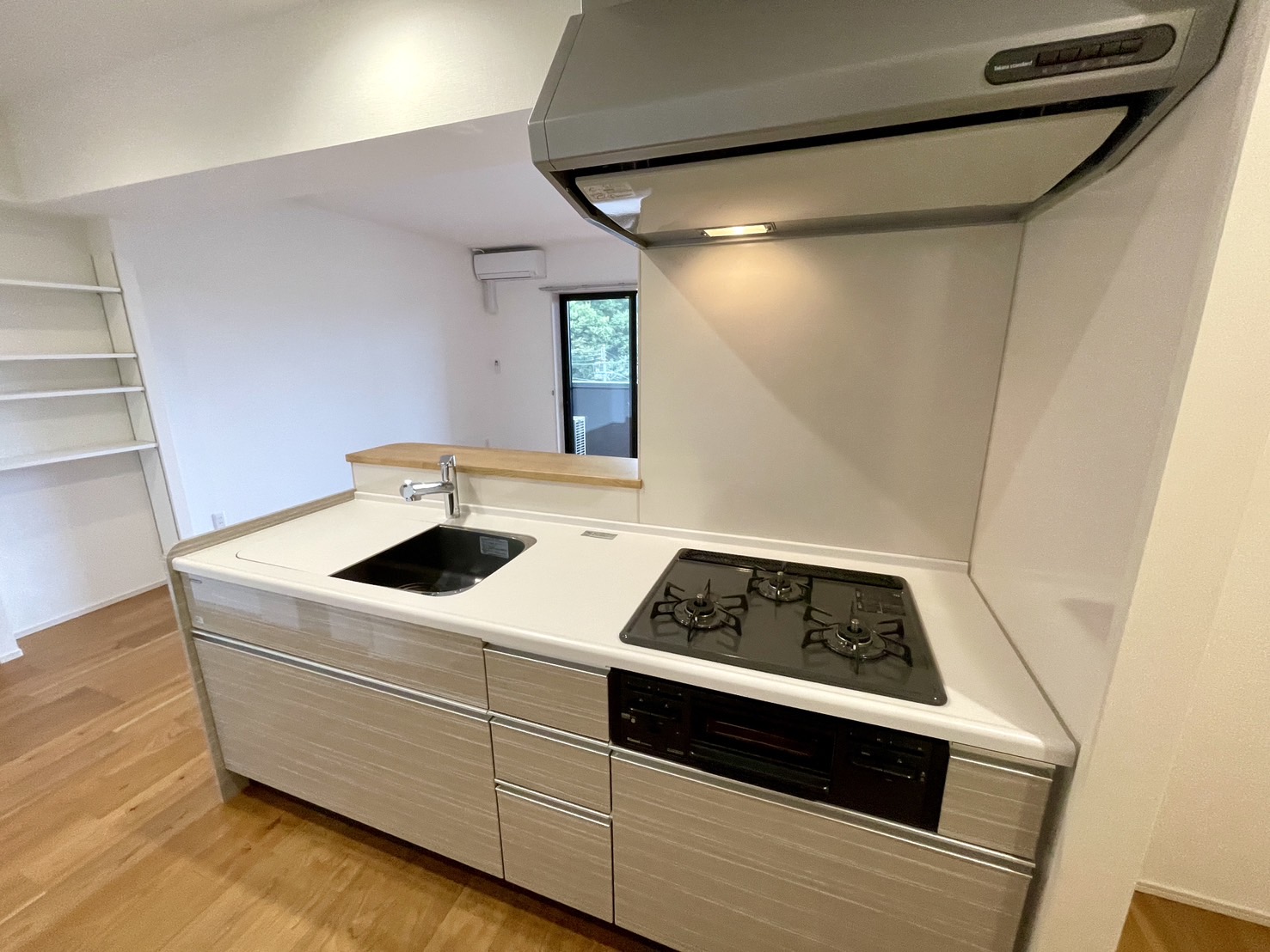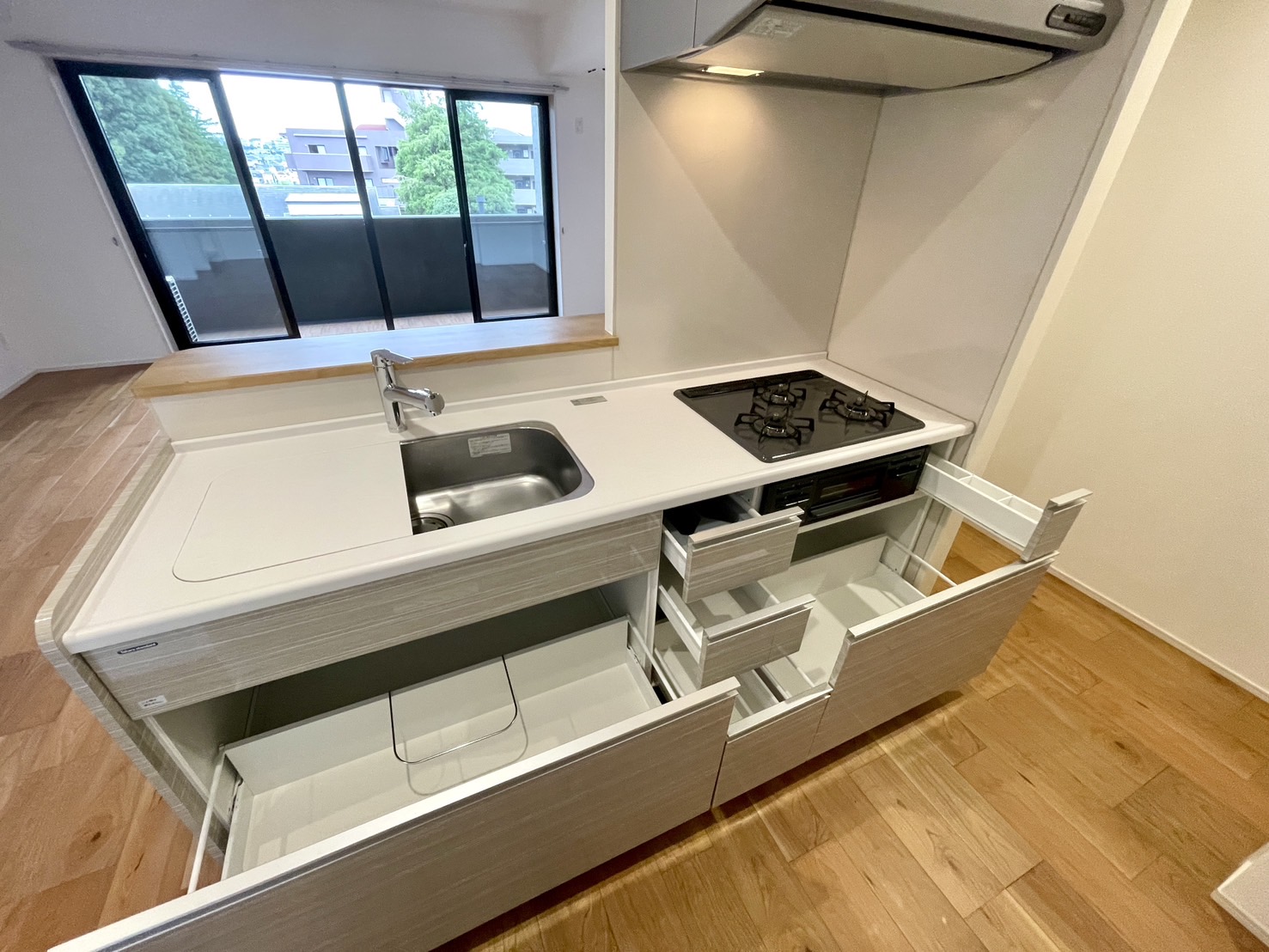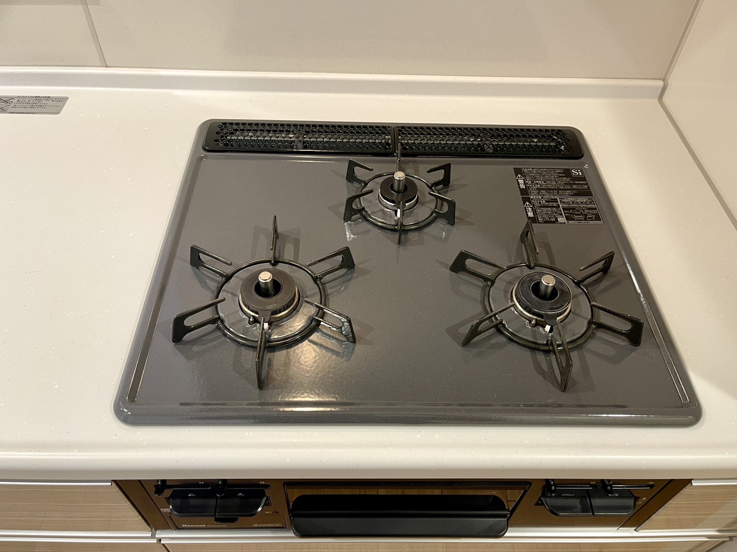 キッチンはタカラスタンダード製。3口コンロにグリルも付いていて、同時調理もラクラクこなせます。