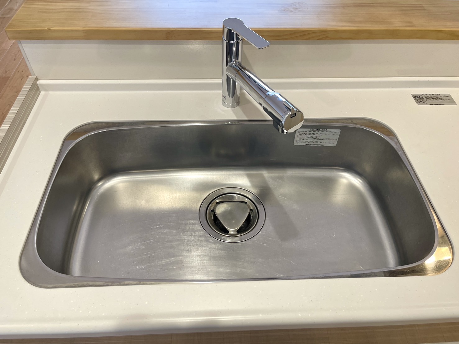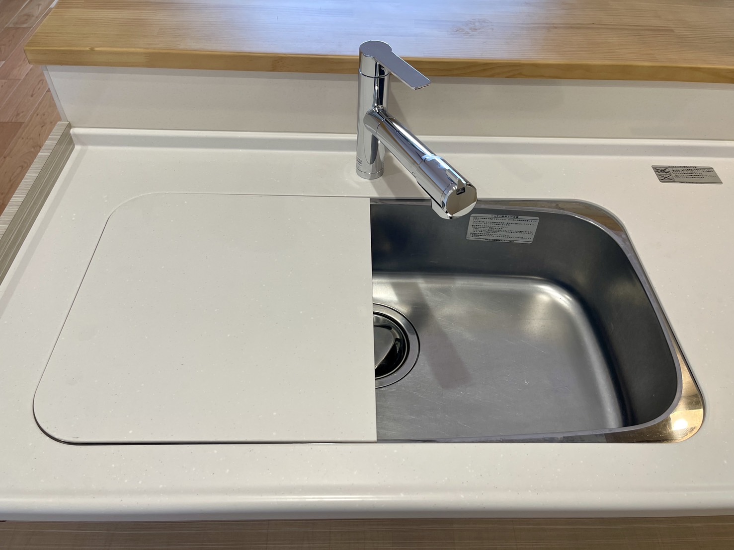 シンクは広々サイズで、半分をカバーできる蓋付きだから作業スペースを広げて使えるのもうれしいところ。