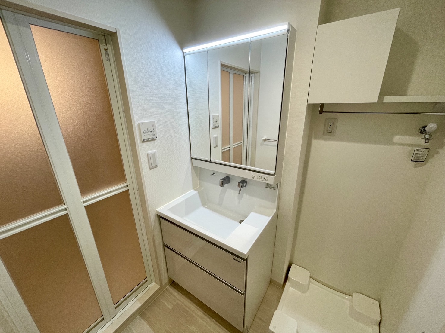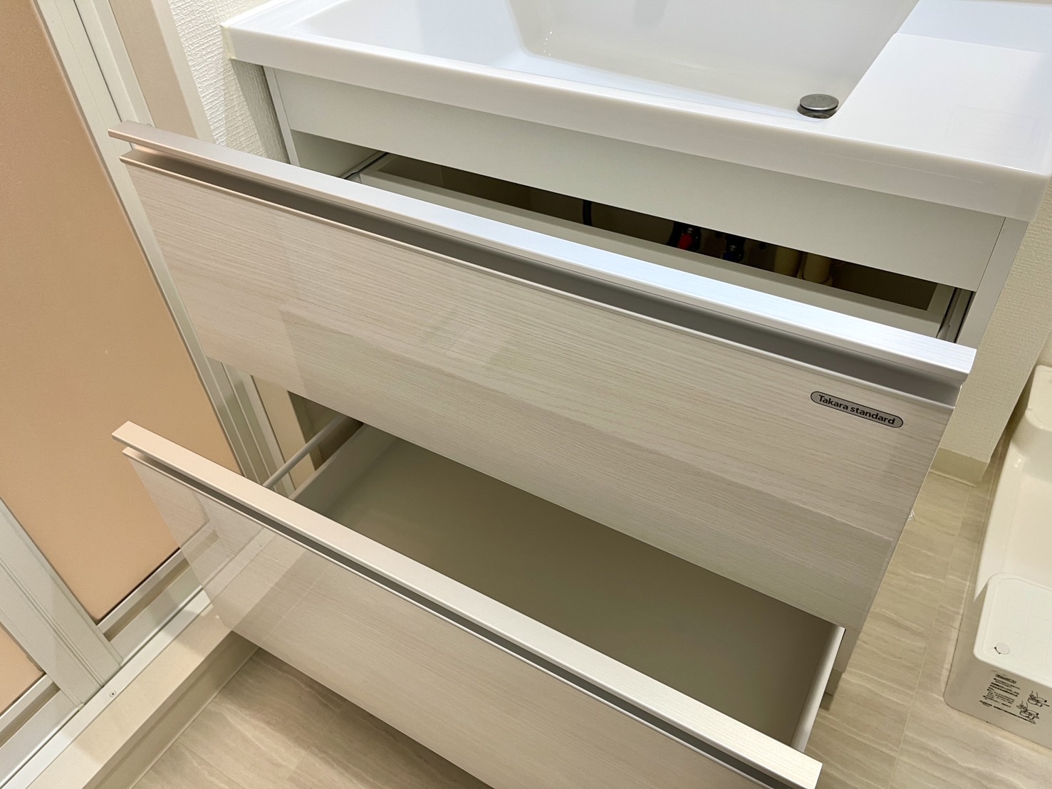 タカラスタンダード製の独立洗面台は、たっぷりとした収納力を備え、蛇口は伸びるタイプで使い勝手も抜群です。