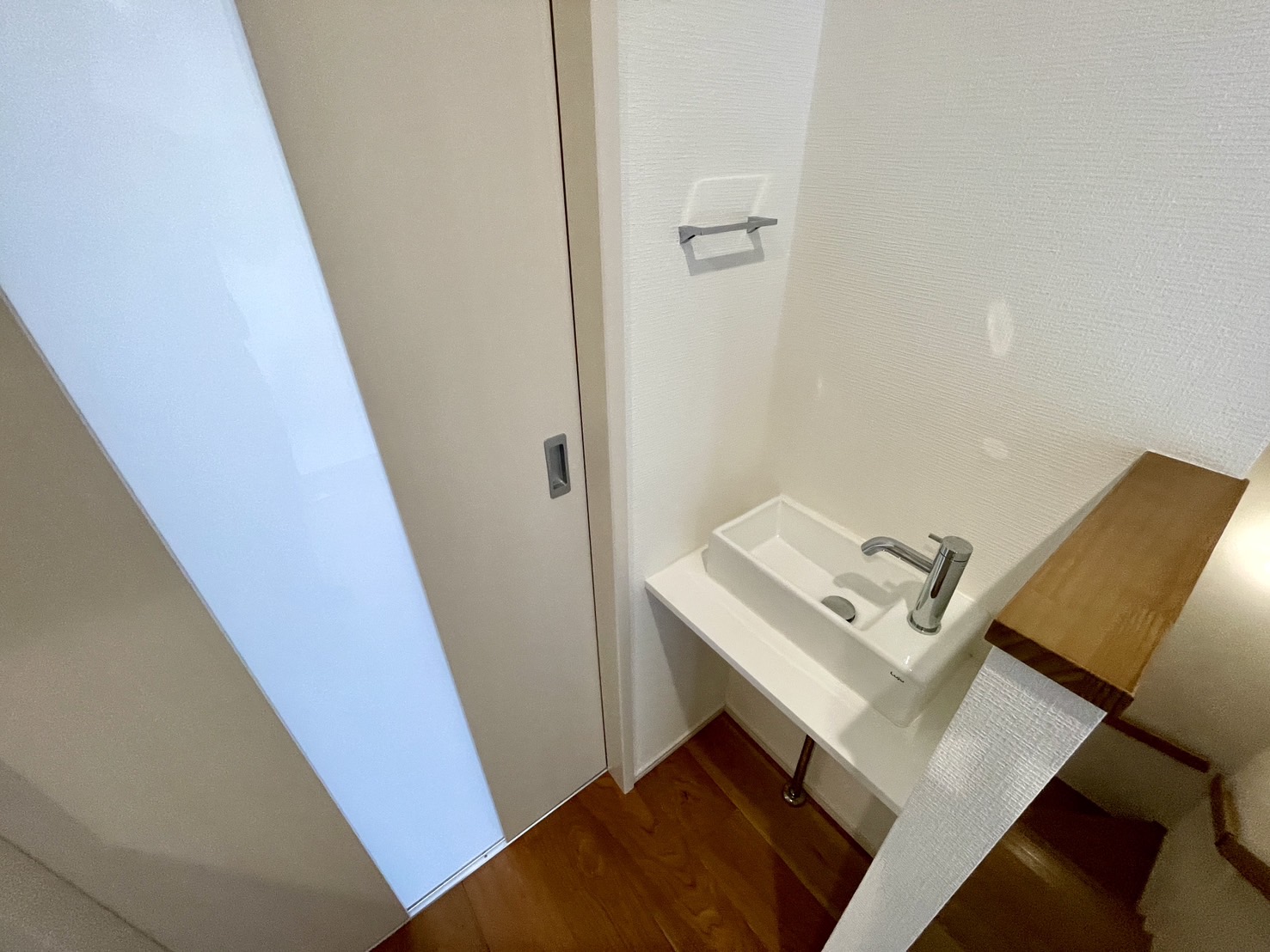 左手にはリビングへ向かうドアがあり、その手前にコンパクトな手洗い水栓があります。