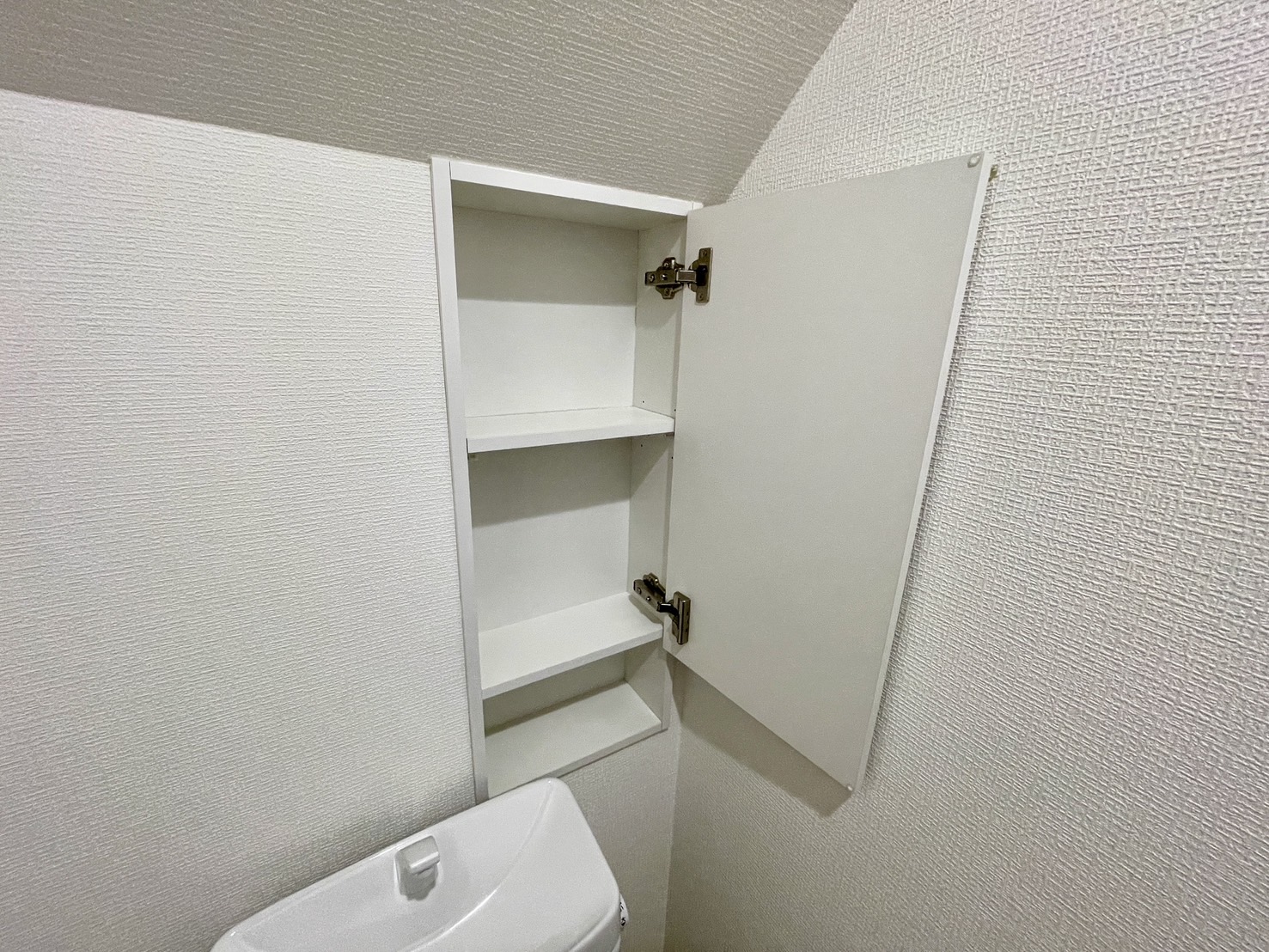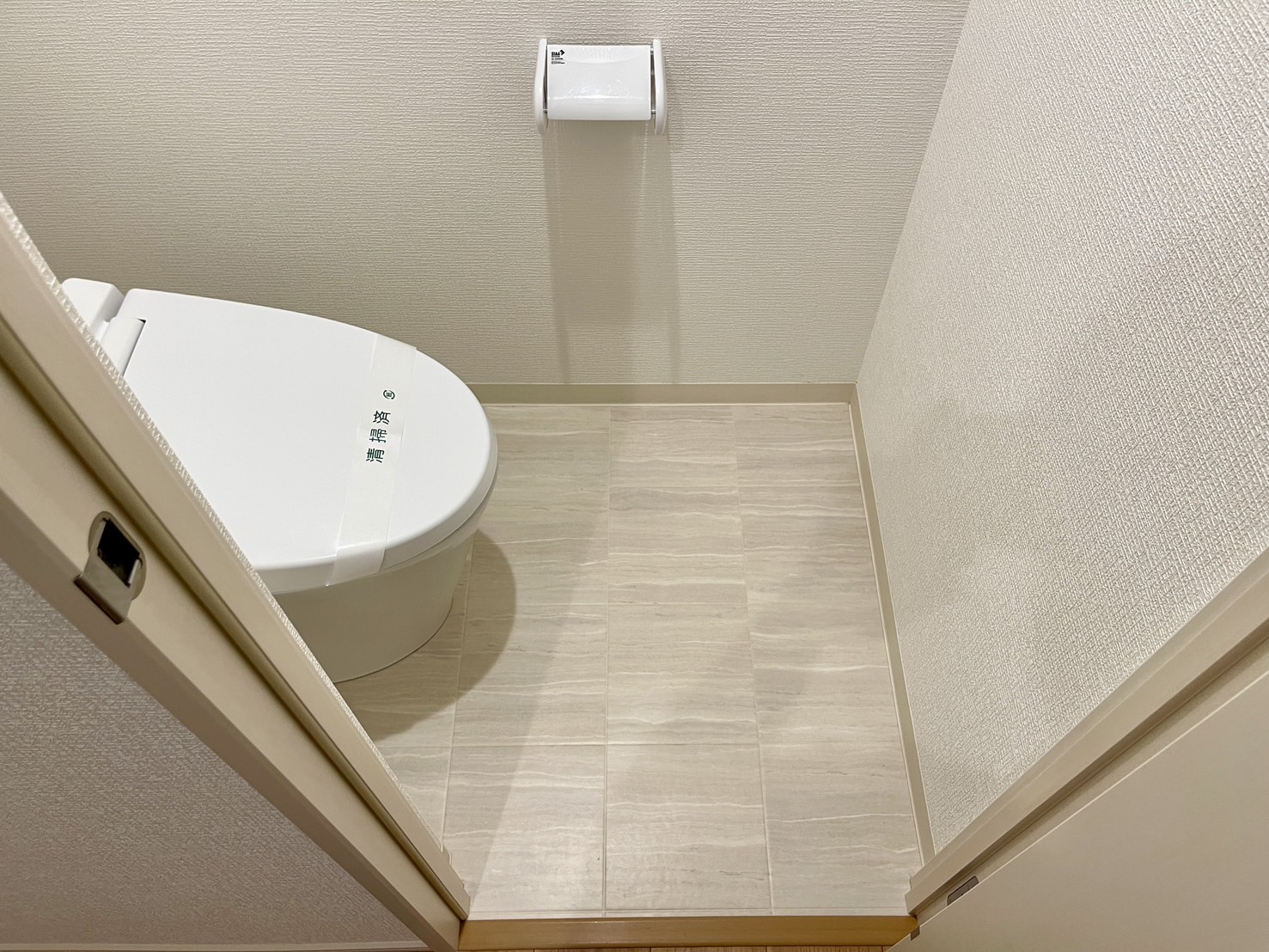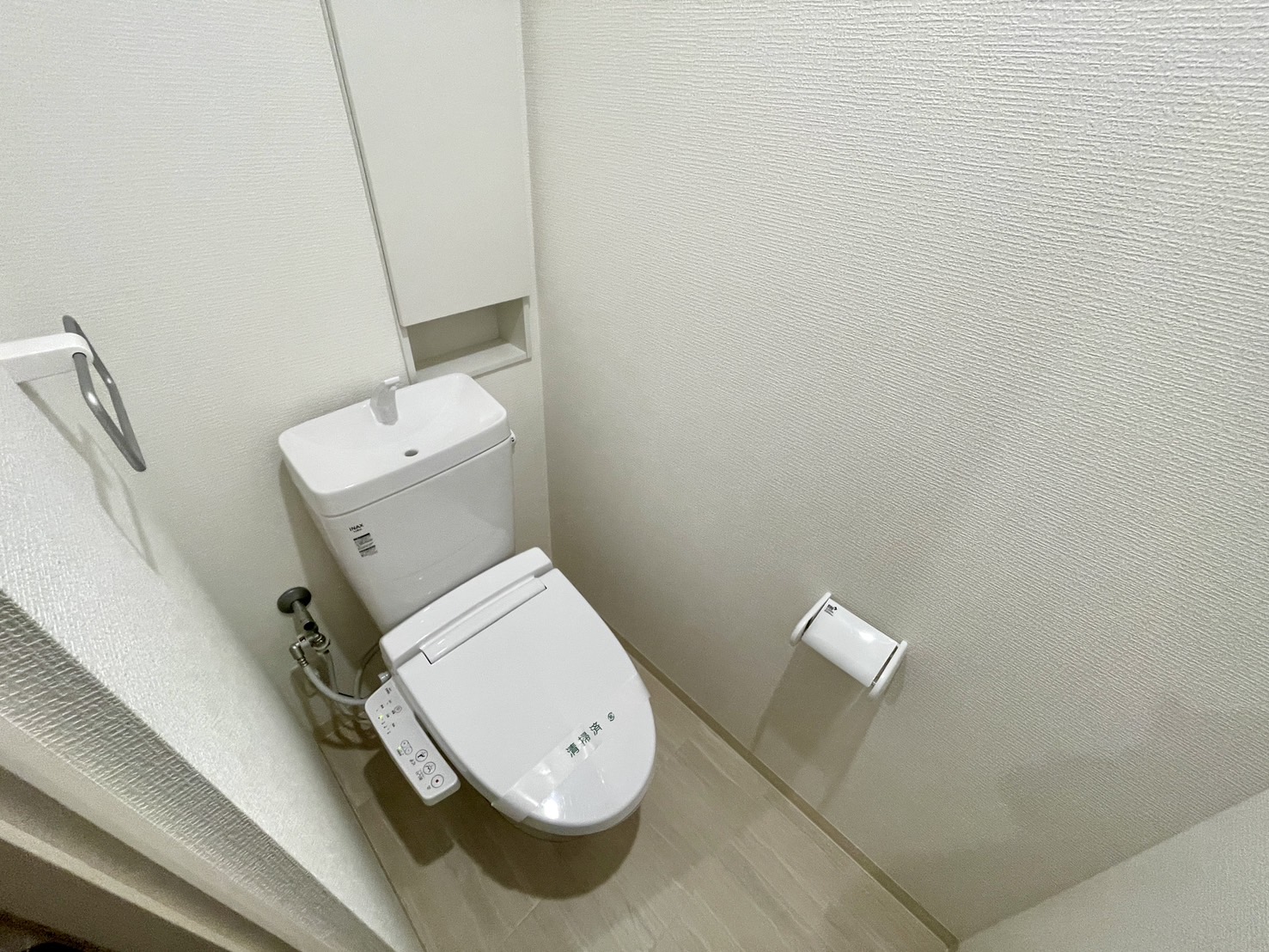 左手の扉を開けると現れるトイレは、壁も天井も白でまとめられ、清潔感あふれる空間。