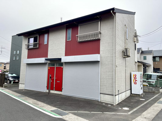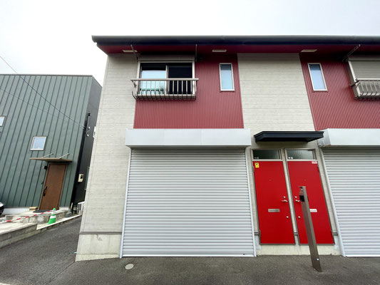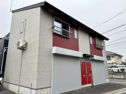 建物外観は片流れの屋根形状とアクセントの赤色が特徴的な2戸物件。