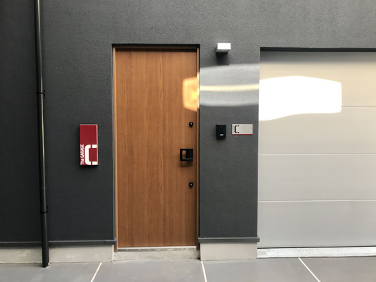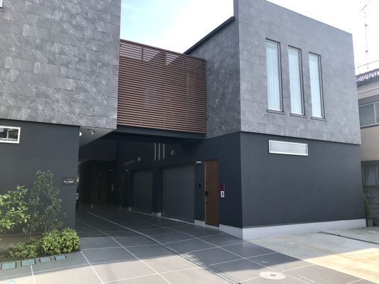 シルバーのシャッター、木目調の玄関ドア、部屋番号プレートなどセンスが光るエントランス。