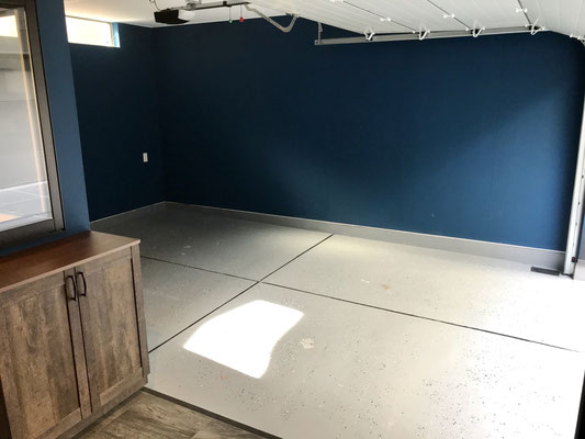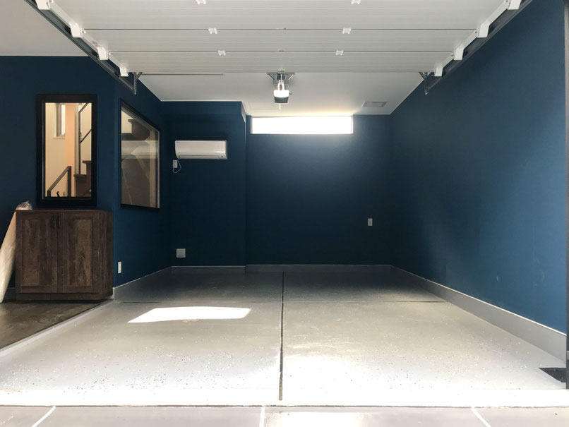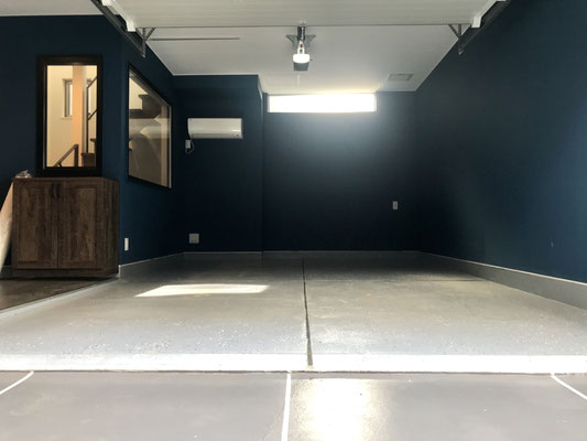 濃いブルーの壁や床材も凝っていて雰囲気の良いガレージ。