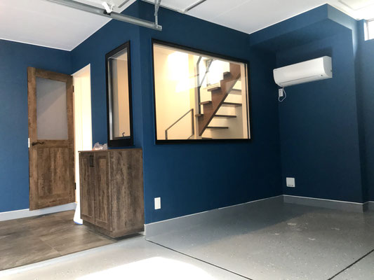 エアコンまであるガレージは1つのお部屋のよう。