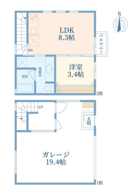2階は8.3帖のLDKと3.4帖のお部屋。