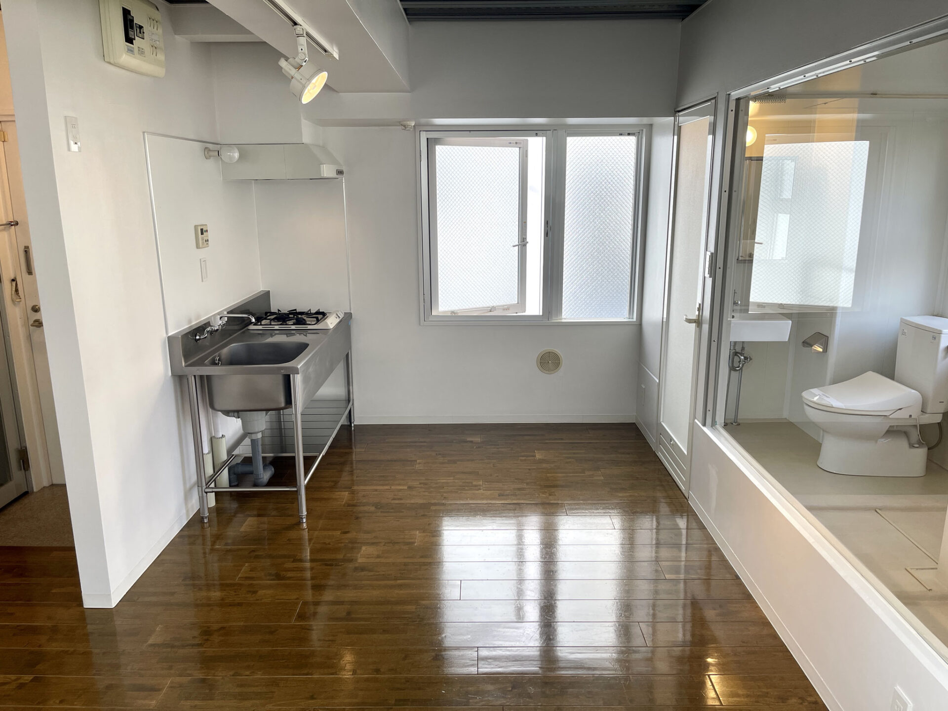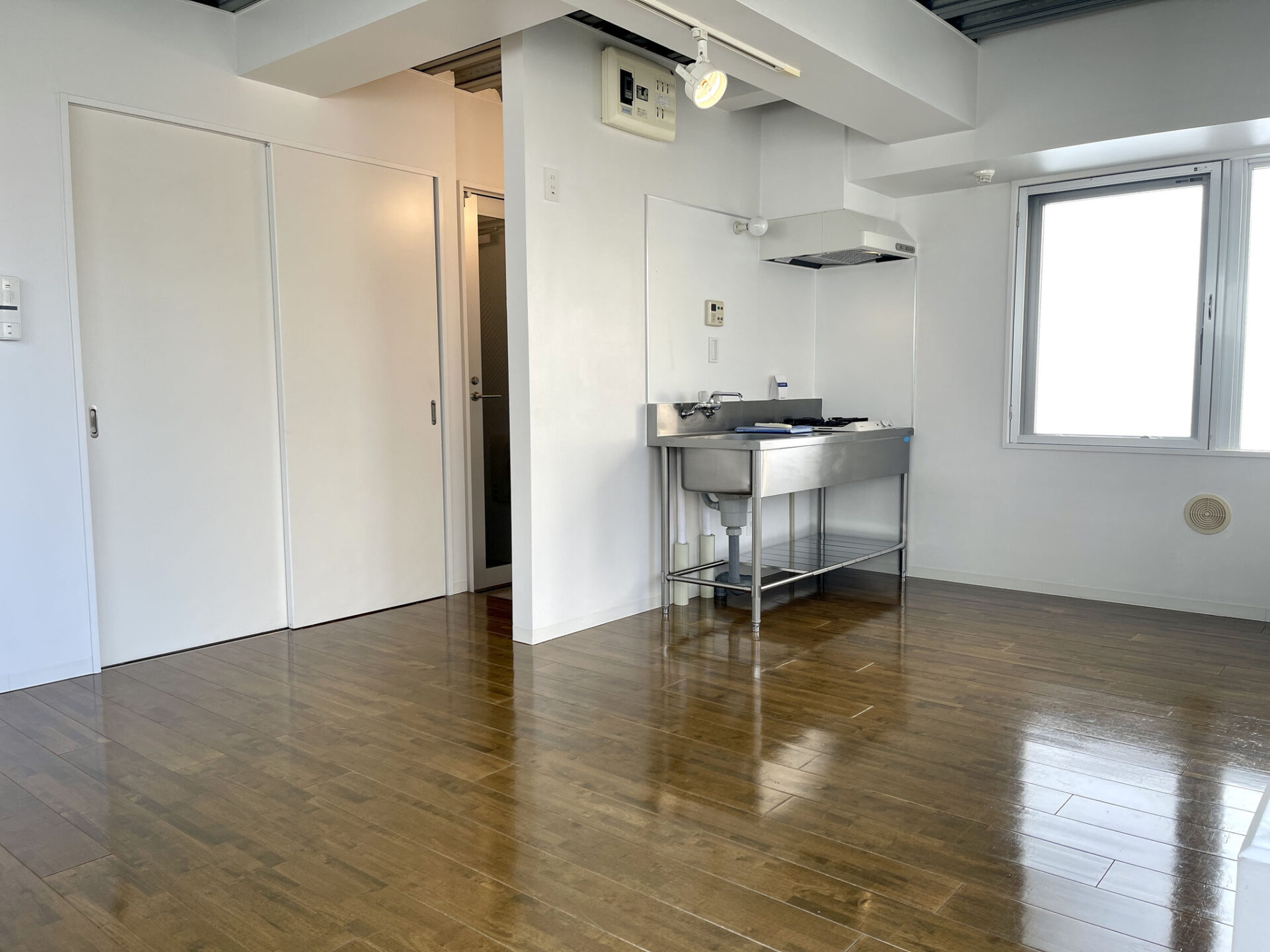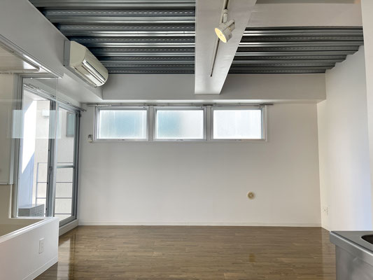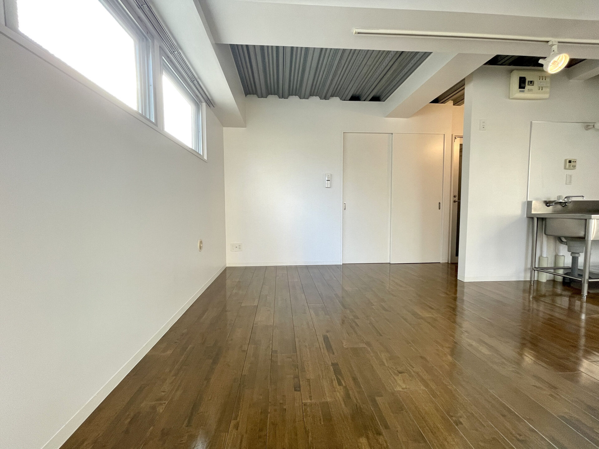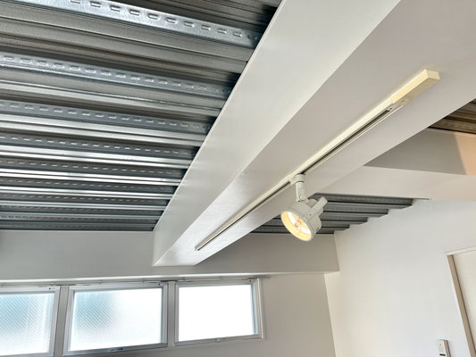 暗めのフローリング床と白の壁、天井の剥き出し鉄板がいい雰囲気ですね〜
