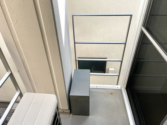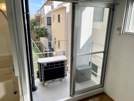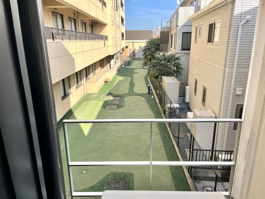 決して日当たりが良い物件じゃないけど、お隣さんのグリーンの庭が見える素敵なバルコニー。