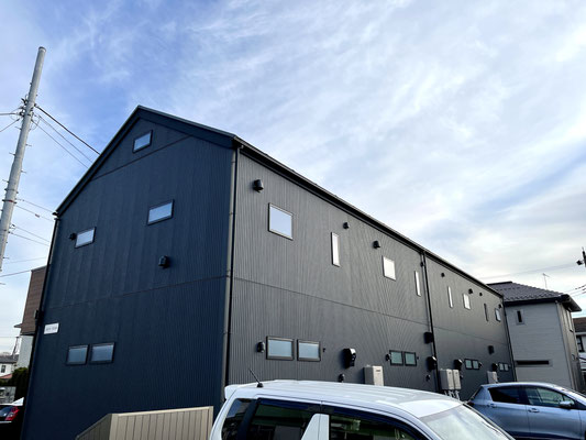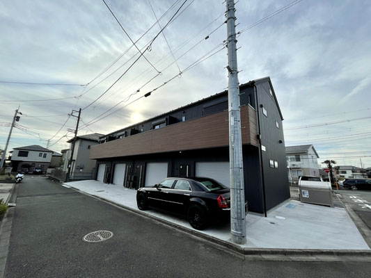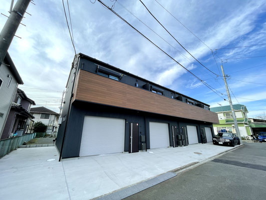 物件はブラックのサイディング仕上げの外壁とバルコニーのウッド調が特徴的な新築4戸物件。
