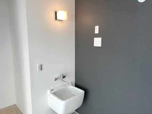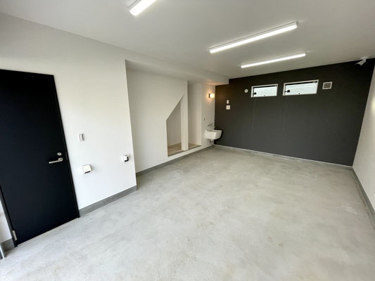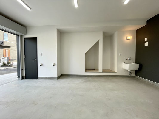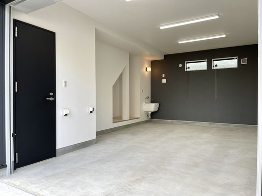 ガレージ内には玄関ホールに出入りできるドア、お湯も出る水栓、換気も出来る窓、