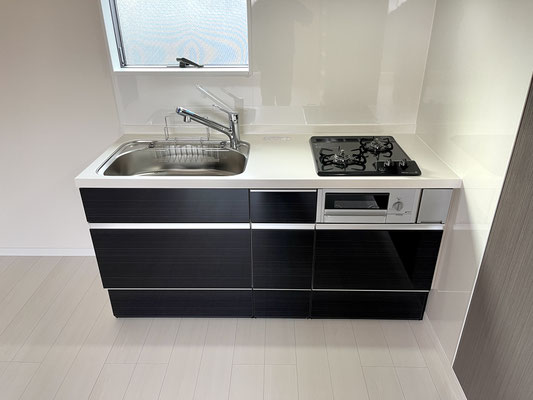 壁際にはシンプルながら使い勝手が良さそうなシステムキッチン。