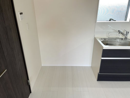 冷蔵庫置場もゆったりサイズなので収納棚なんかを追加で置いても良さそう♪