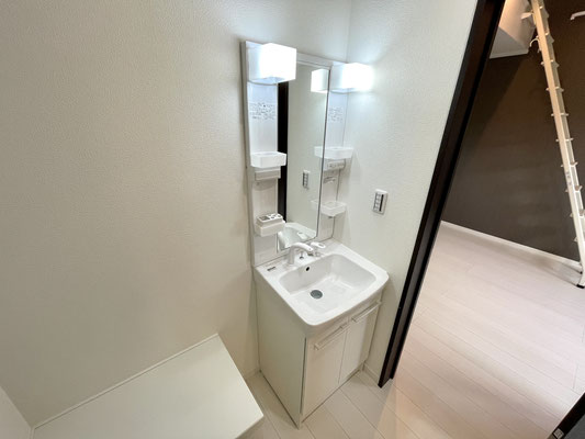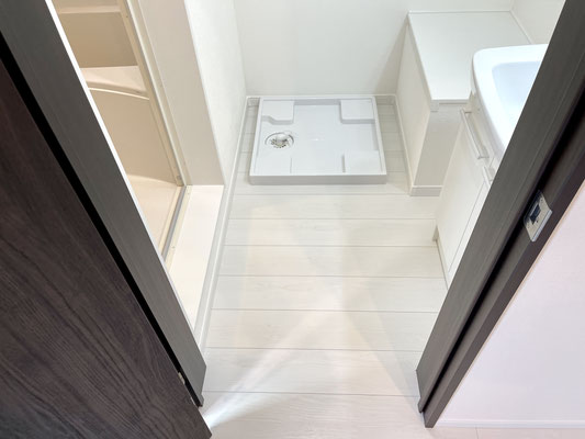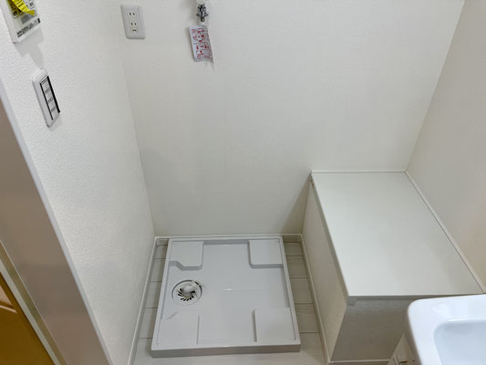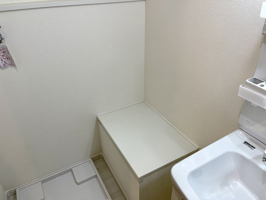 洗濯機置場の横には収納棚を置くのに丁度いい台があります。