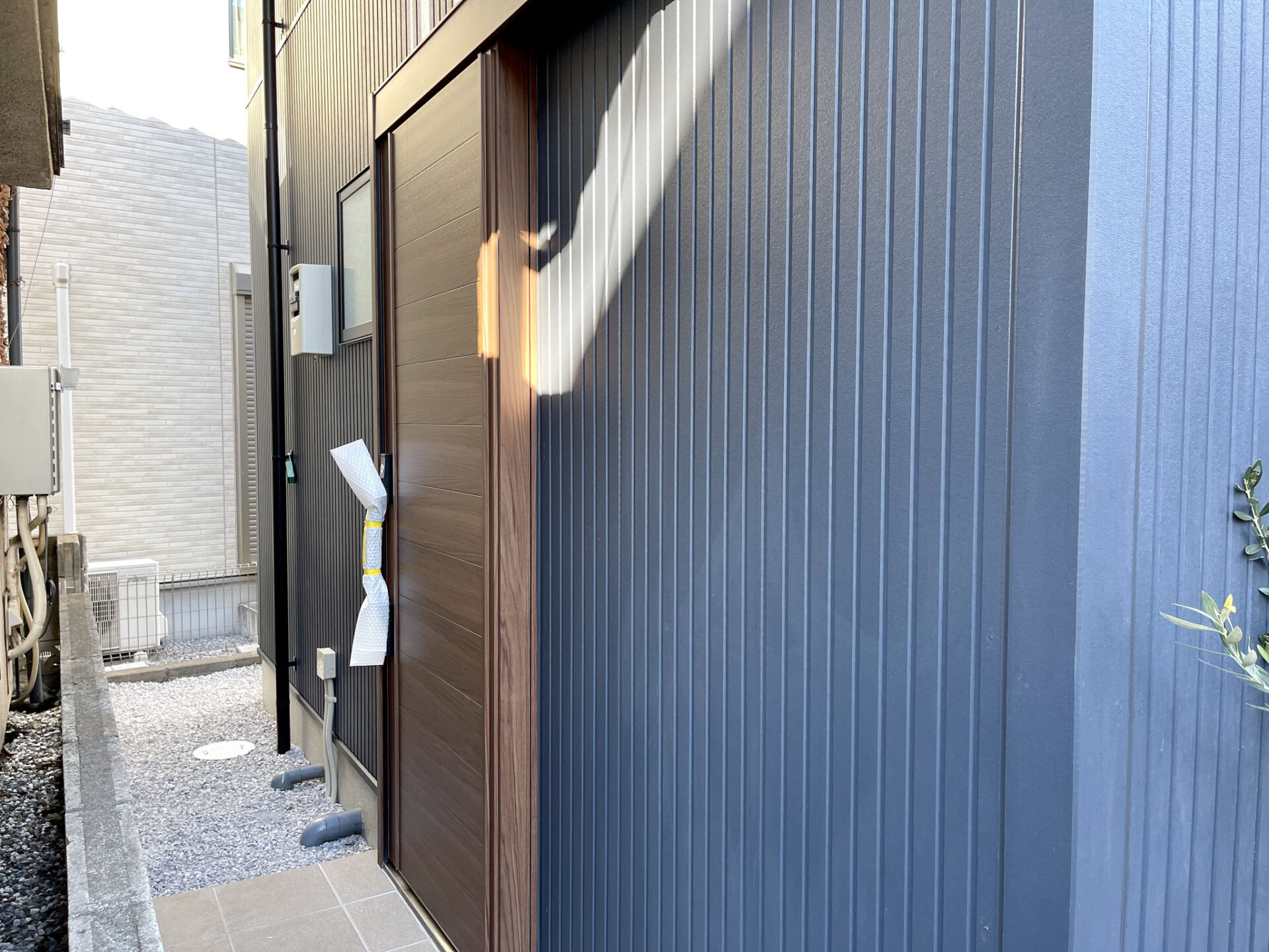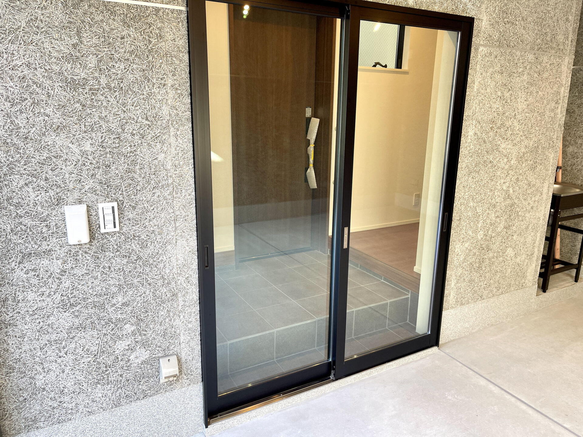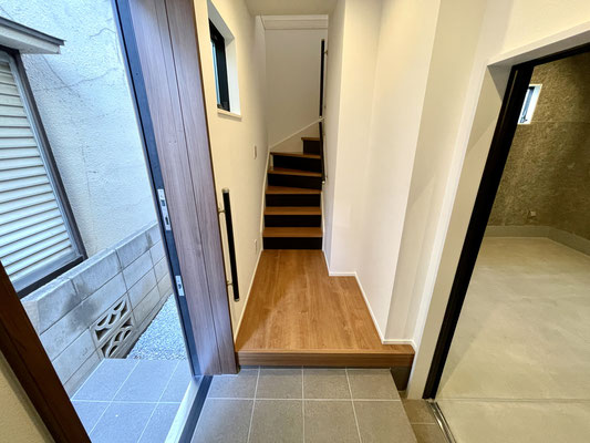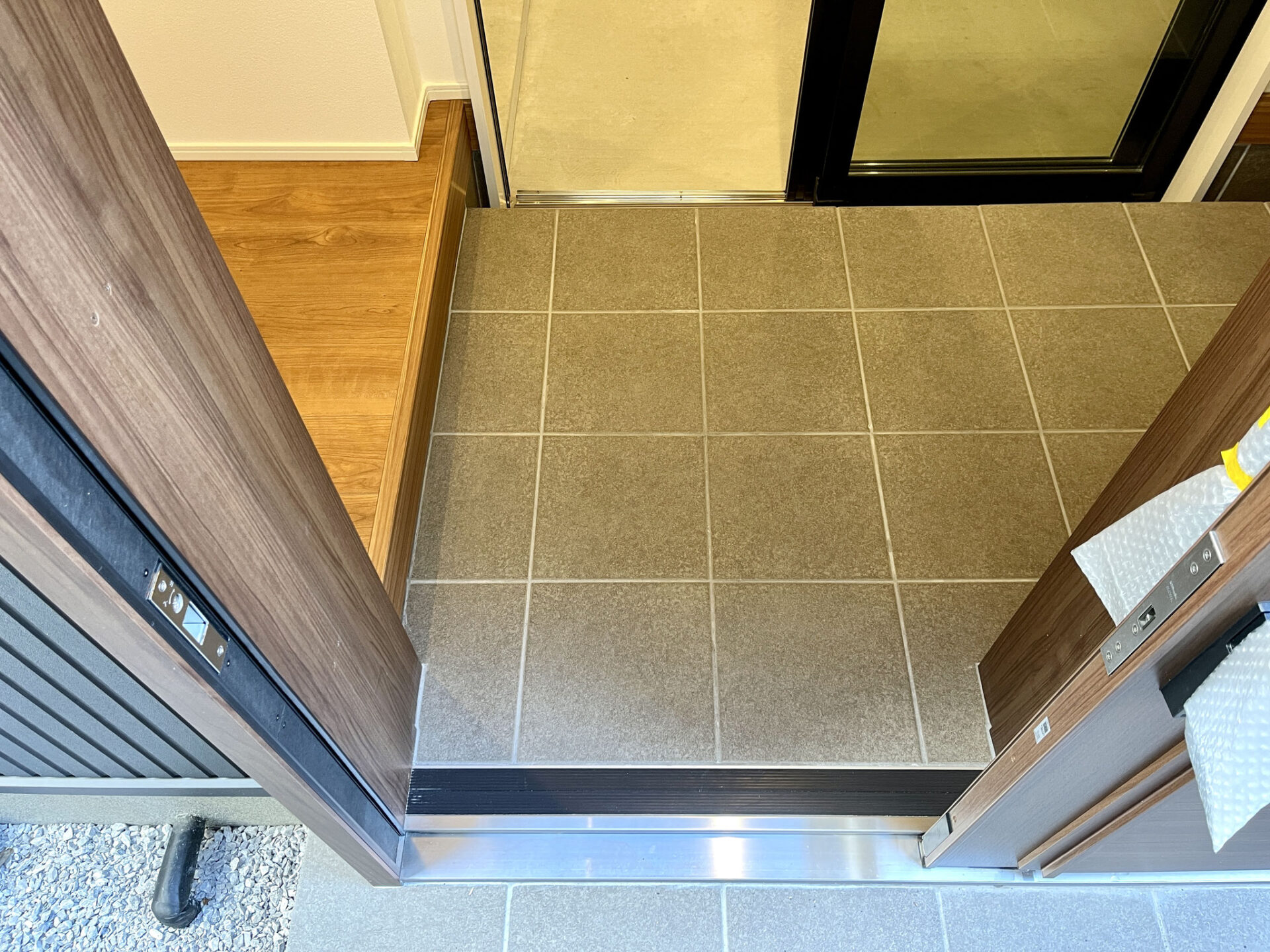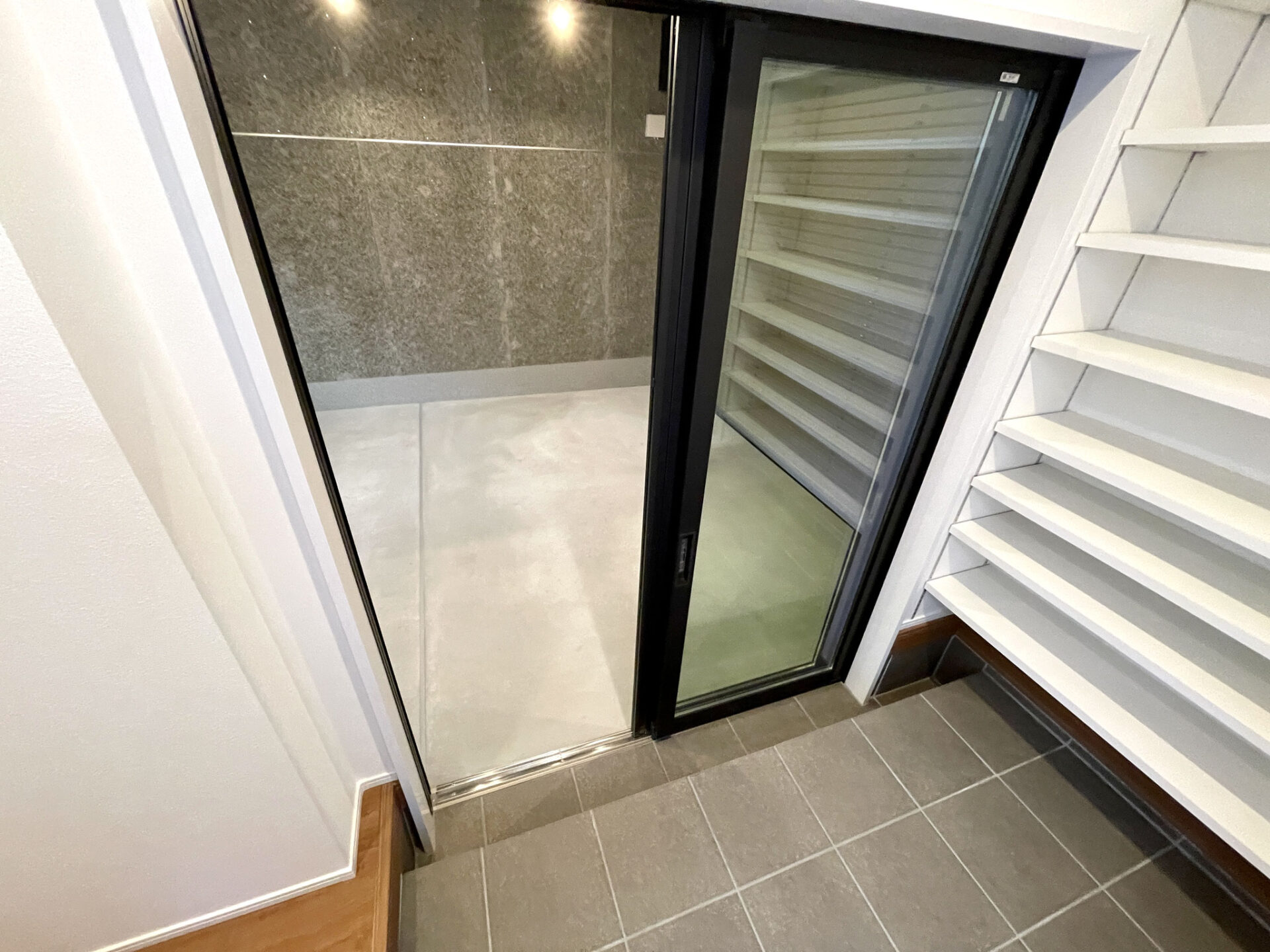 玄関ドアには珍しいスライドドアでスペースの有効活用。