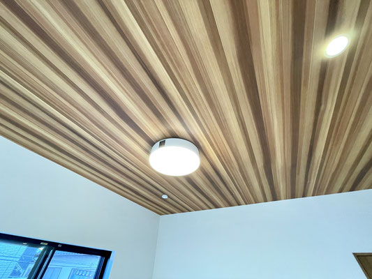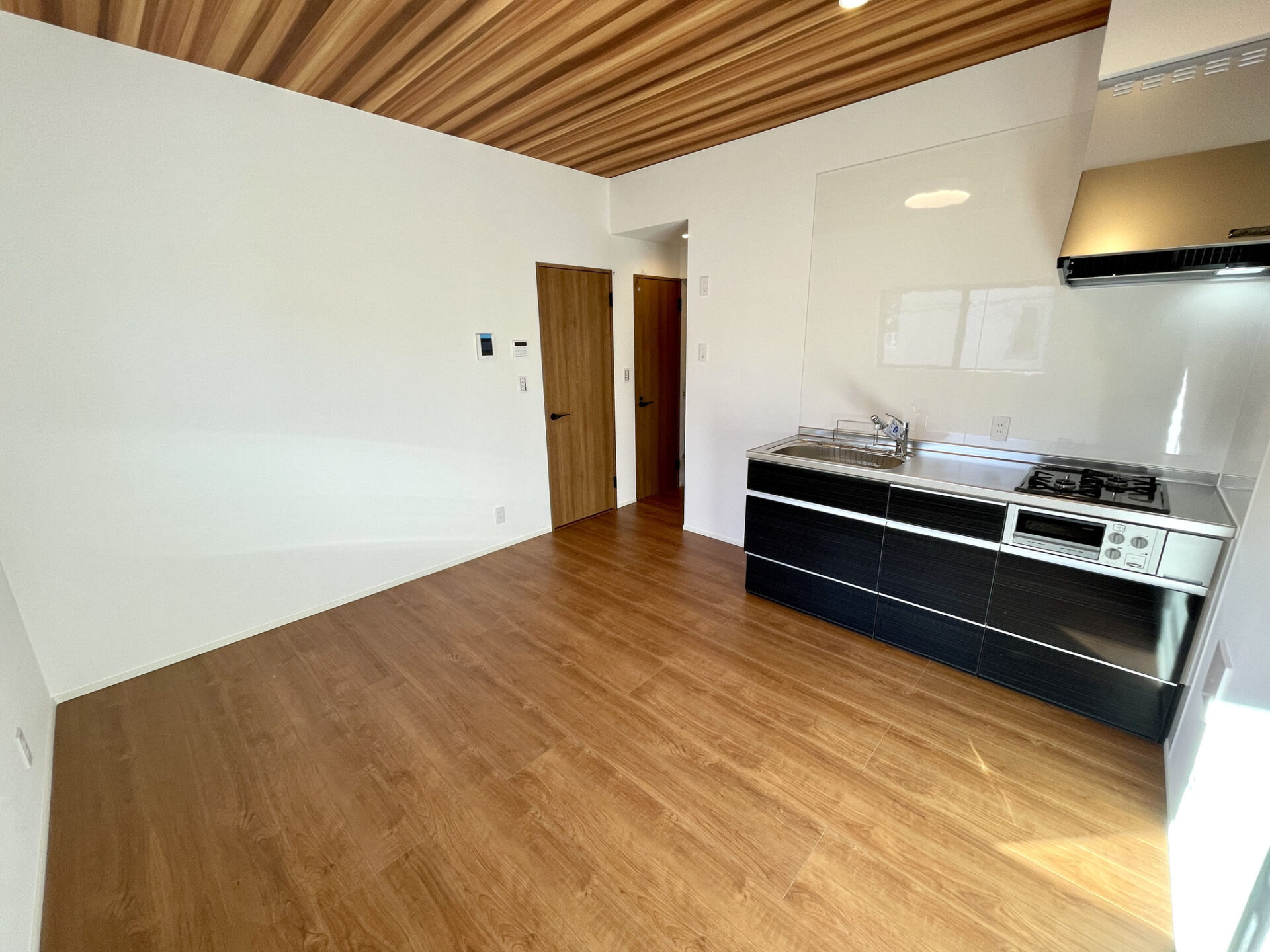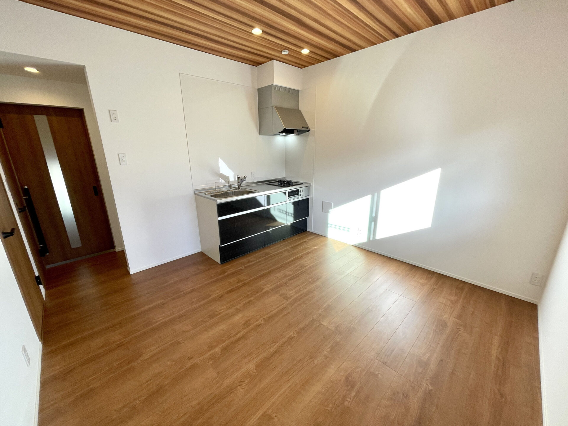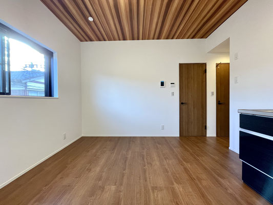 無垢材のようなしっとりとしたフローリングと天井の美しい木目が特徴的なお部屋です。