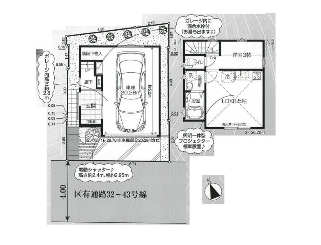 ガレージのサイズは20.28㎡ 間口は約3.2m 横幅は約3.5m