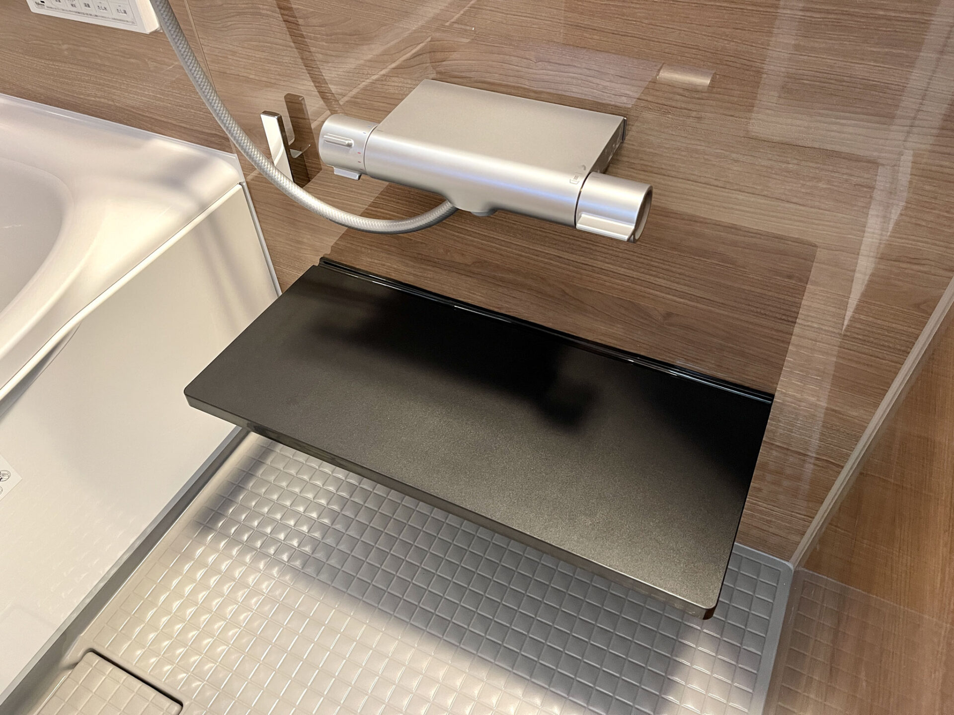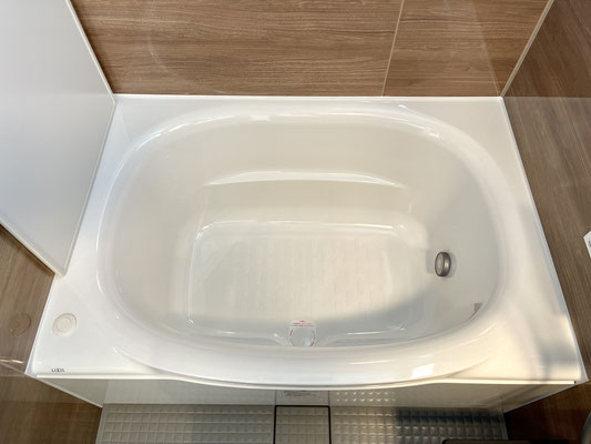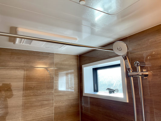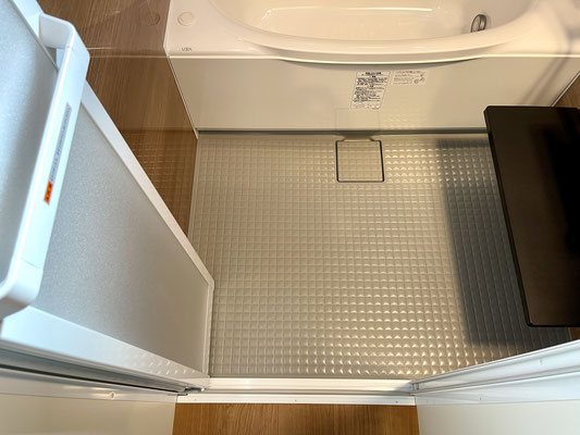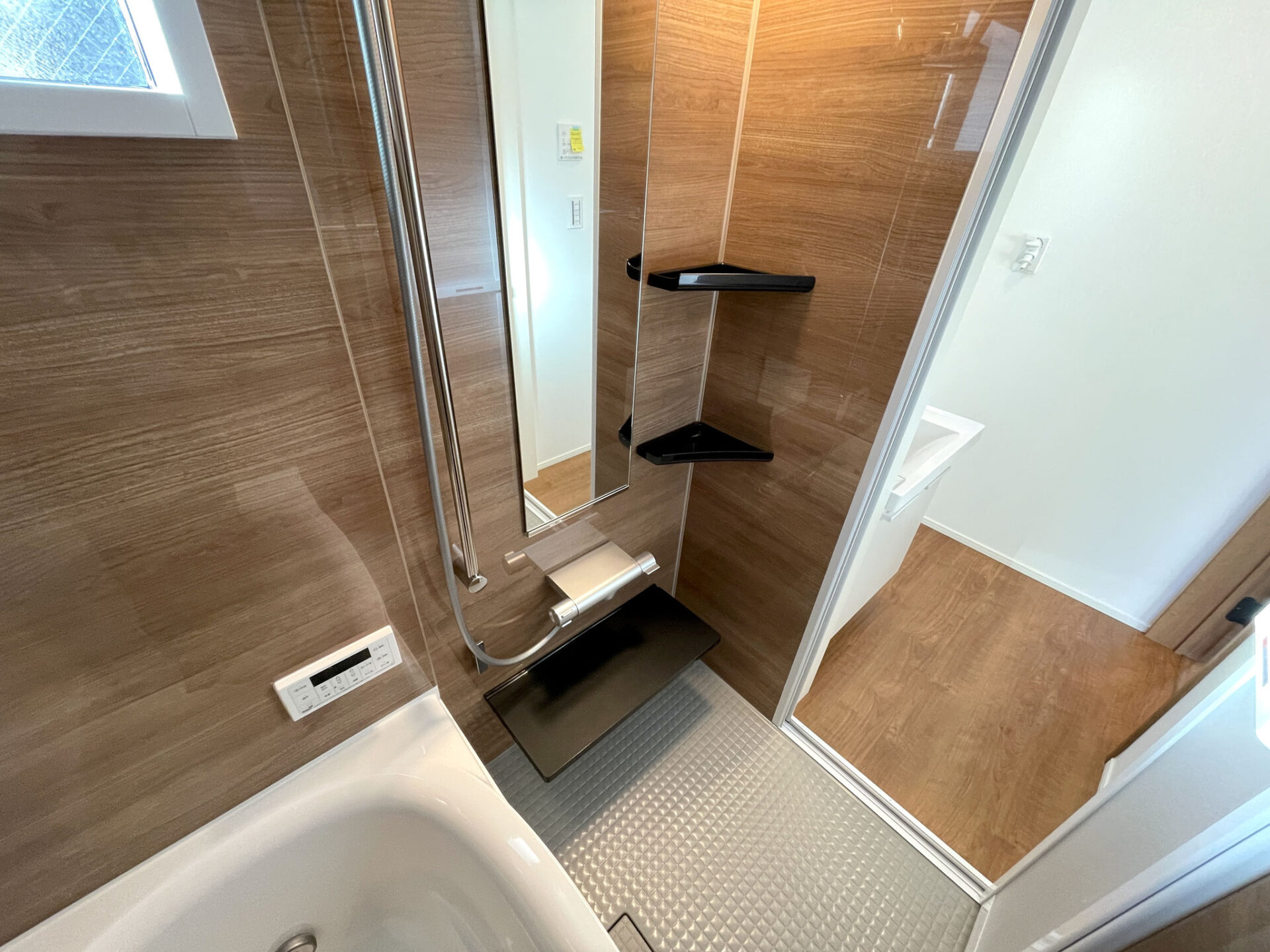 落ち着いたウッド調のピカピカバスルームです。