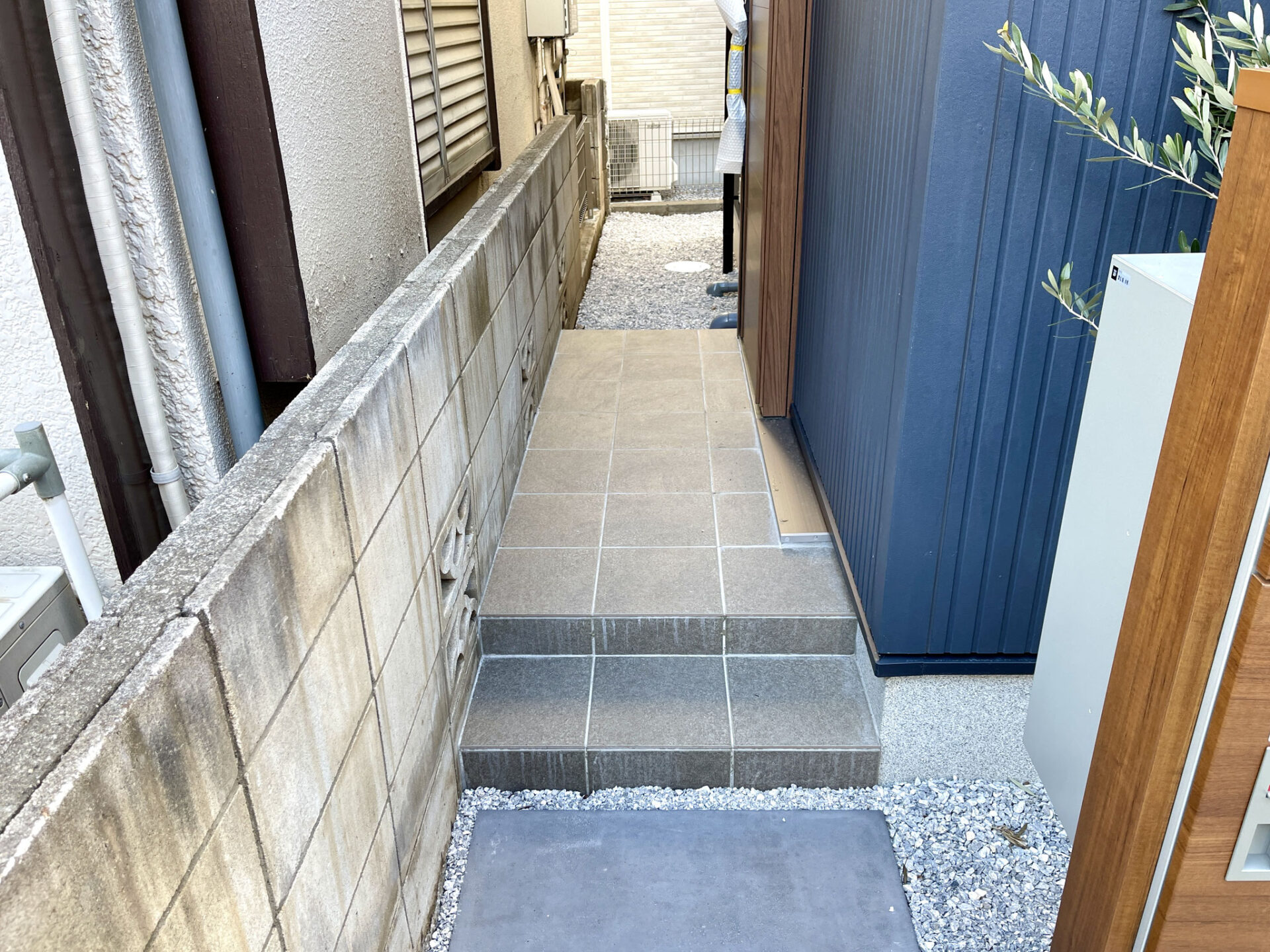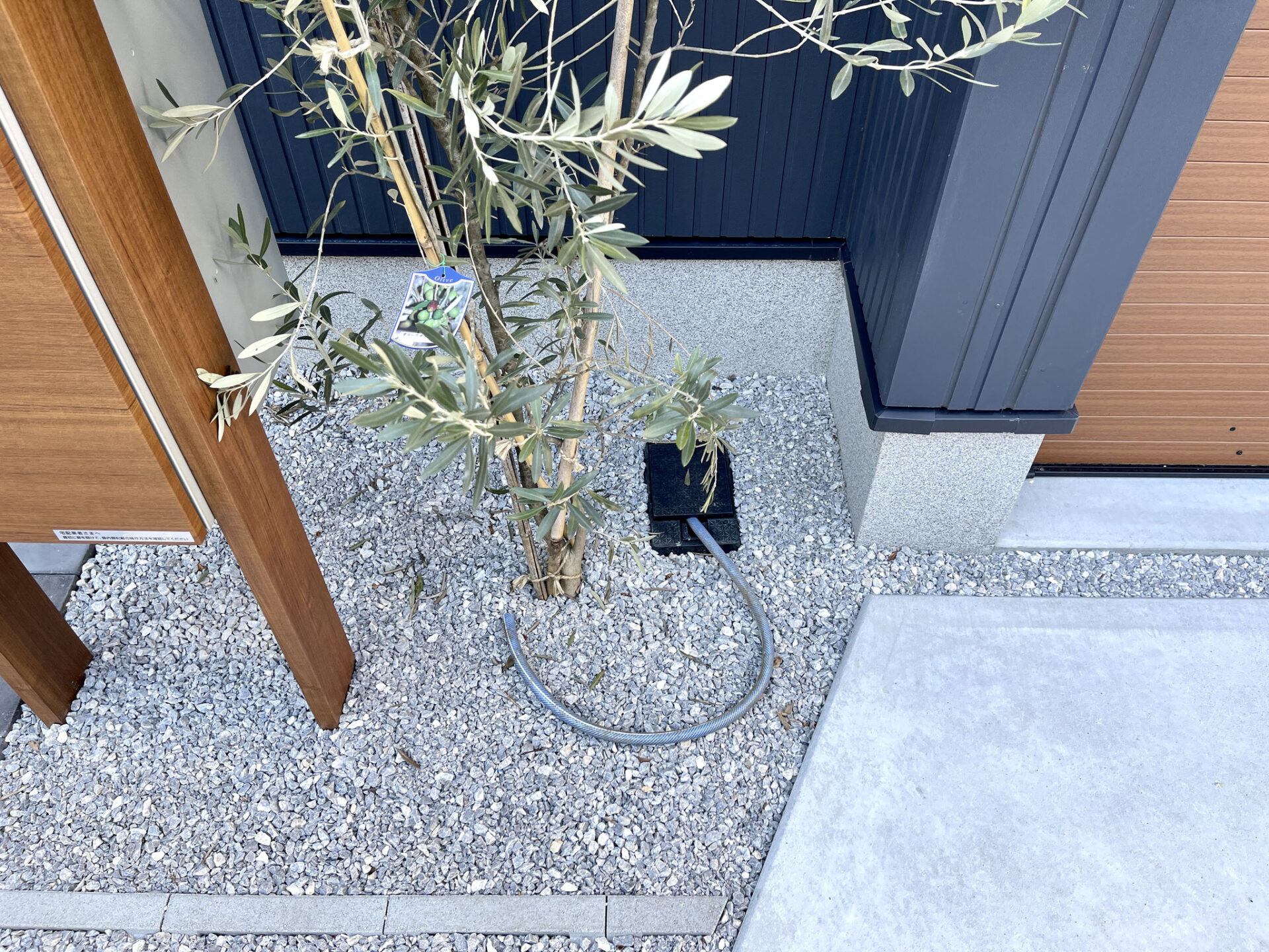 建物外観はブルーグレーの外壁に片流れの屋根、