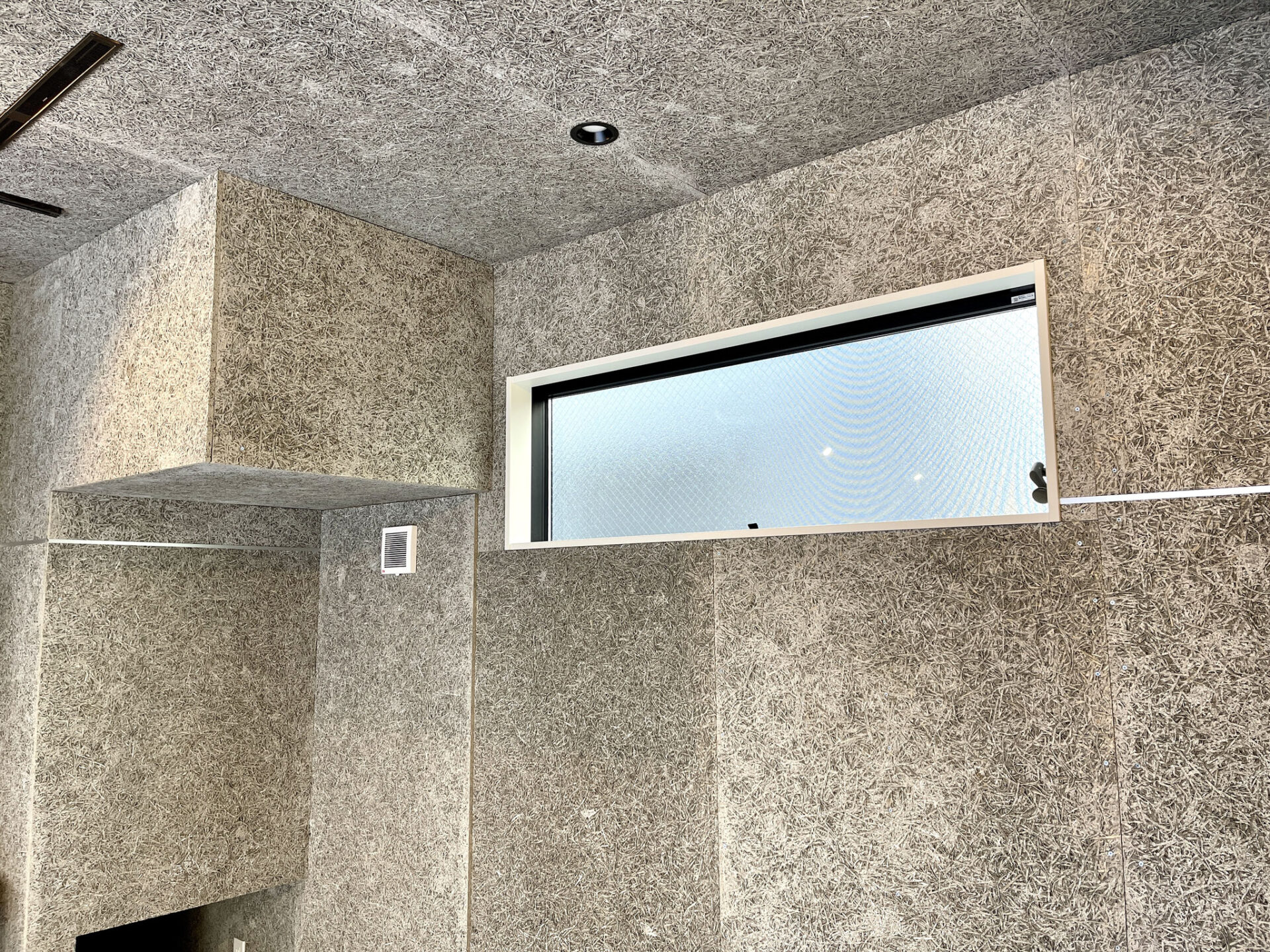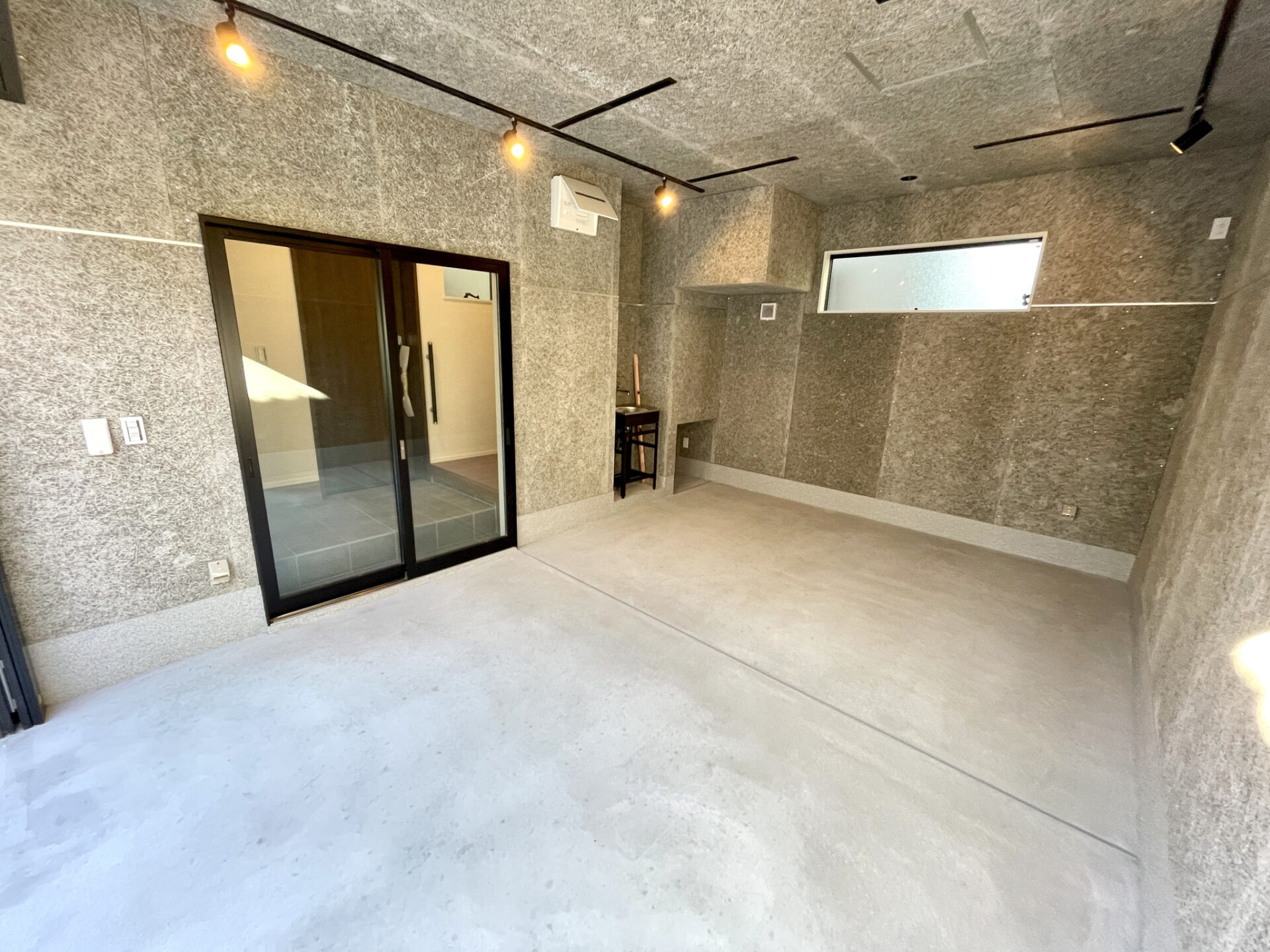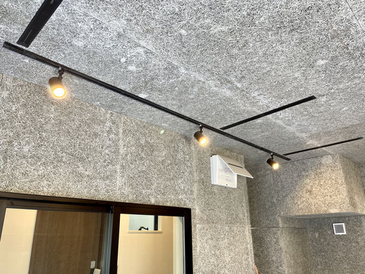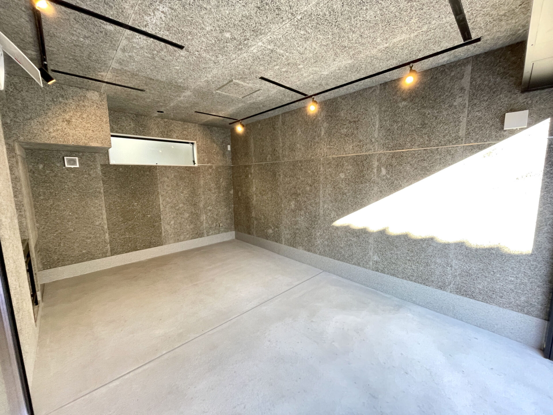 木毛セメント板の壁や天井が特徴的なガレージ。