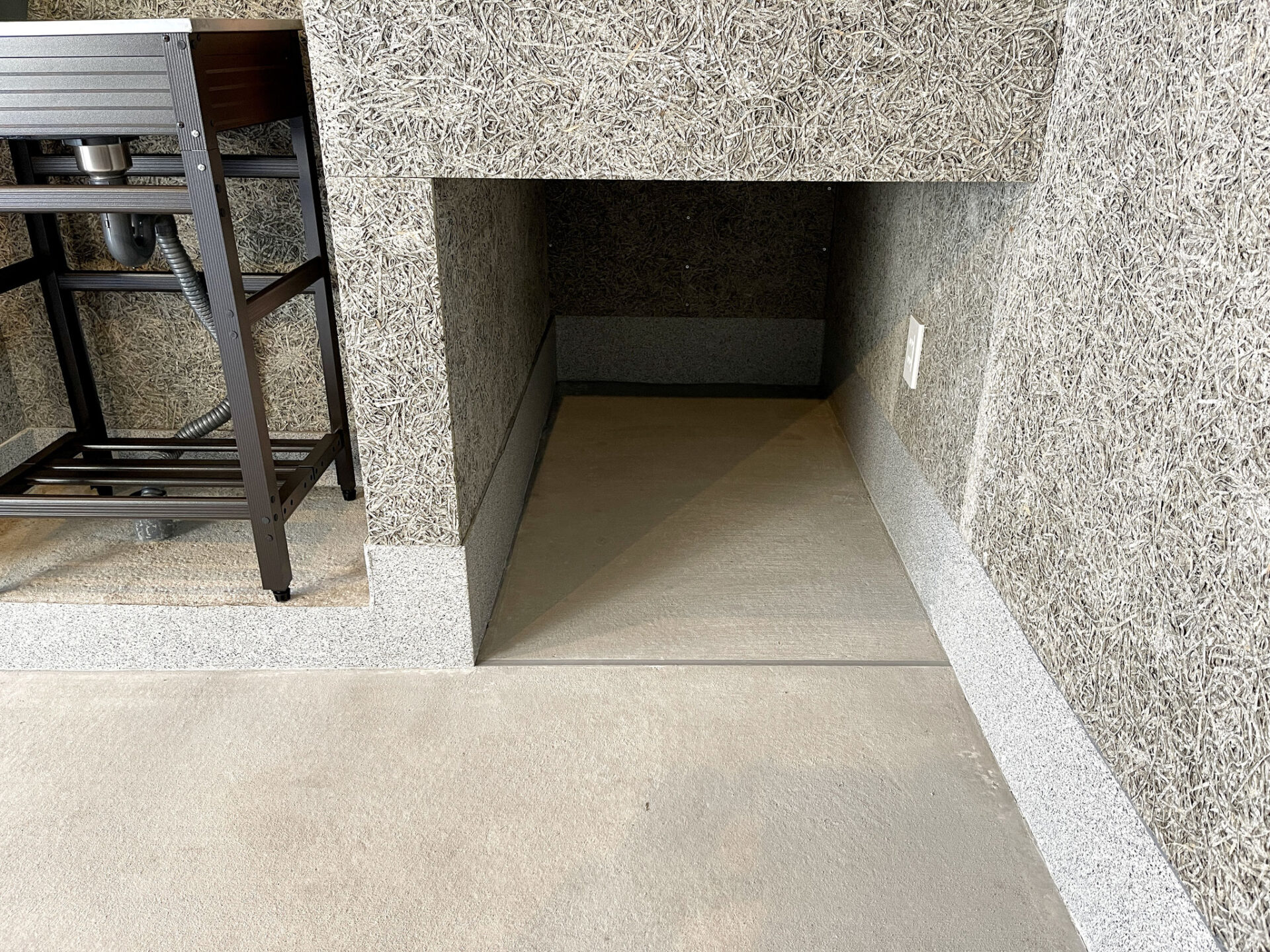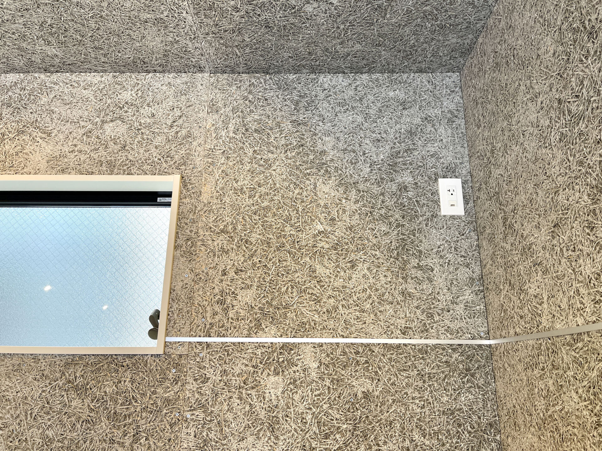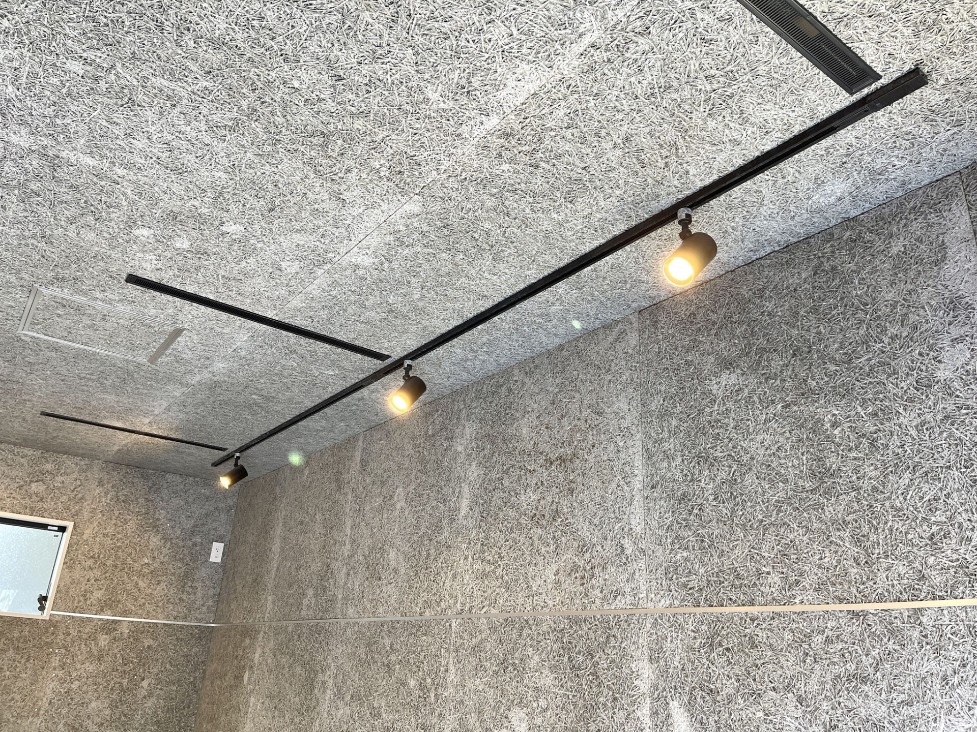 木毛セメント板の壁や天井が特徴的なガレージ。