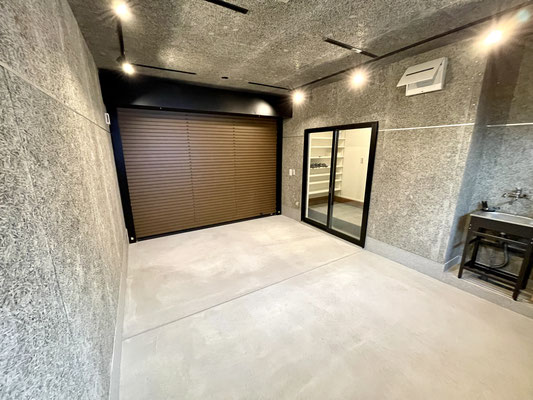 ガレージ内には玄関土間に通じるスライドドアやお湯も出る水栓、開閉可能な窓など装備も豪華。