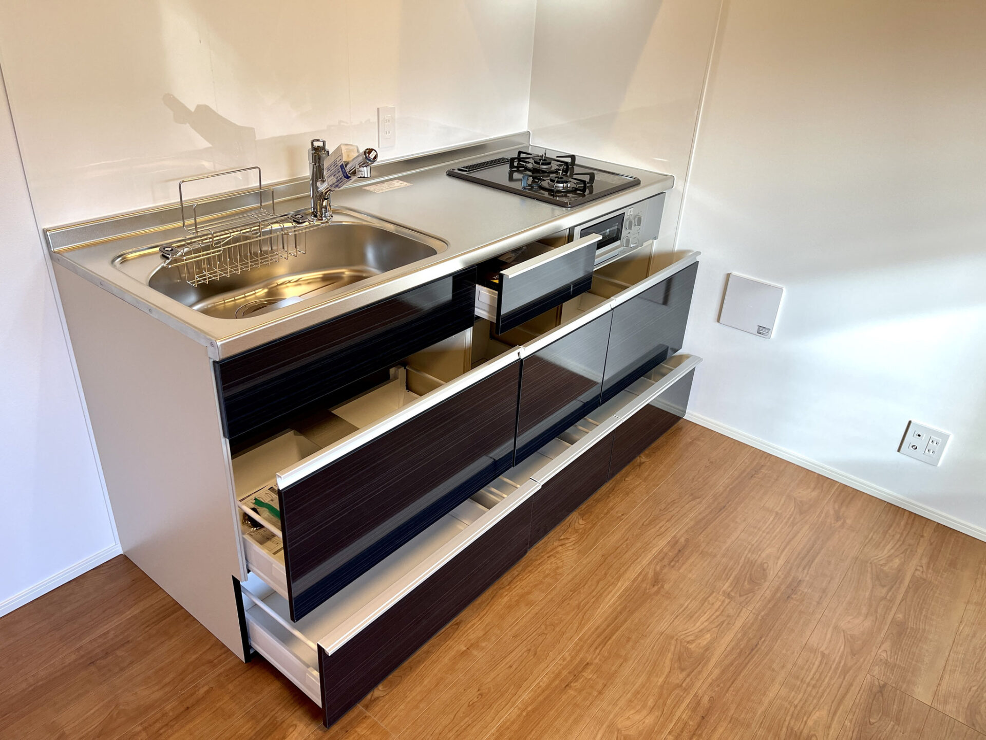 上部収納はありませんがキッチンは3段引き出しの大収納。