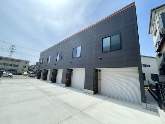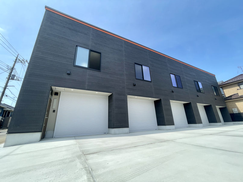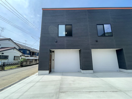 建物外観はブラックの外壁に白いガレージシャッター、建物上部にはオレンジのラインが入り