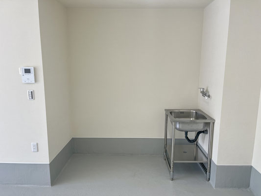 ガレージ内にはその他にも玄関ホールに通じるスライドドアやお湯も出る水栓、インターホンモニター、