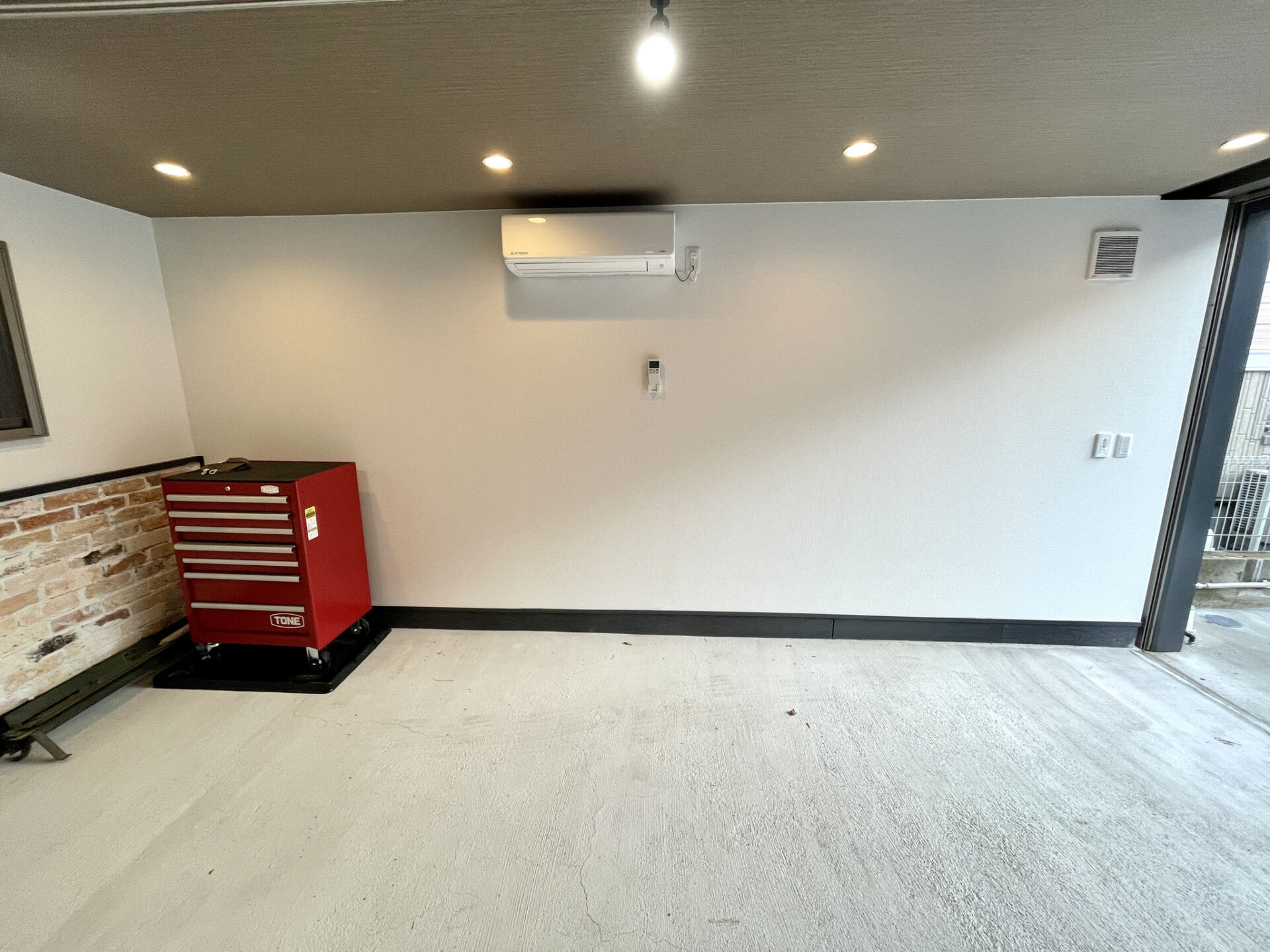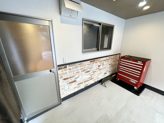 天井のウッド調とガレージ奥のイミテーションレンガがアクセントになっています。