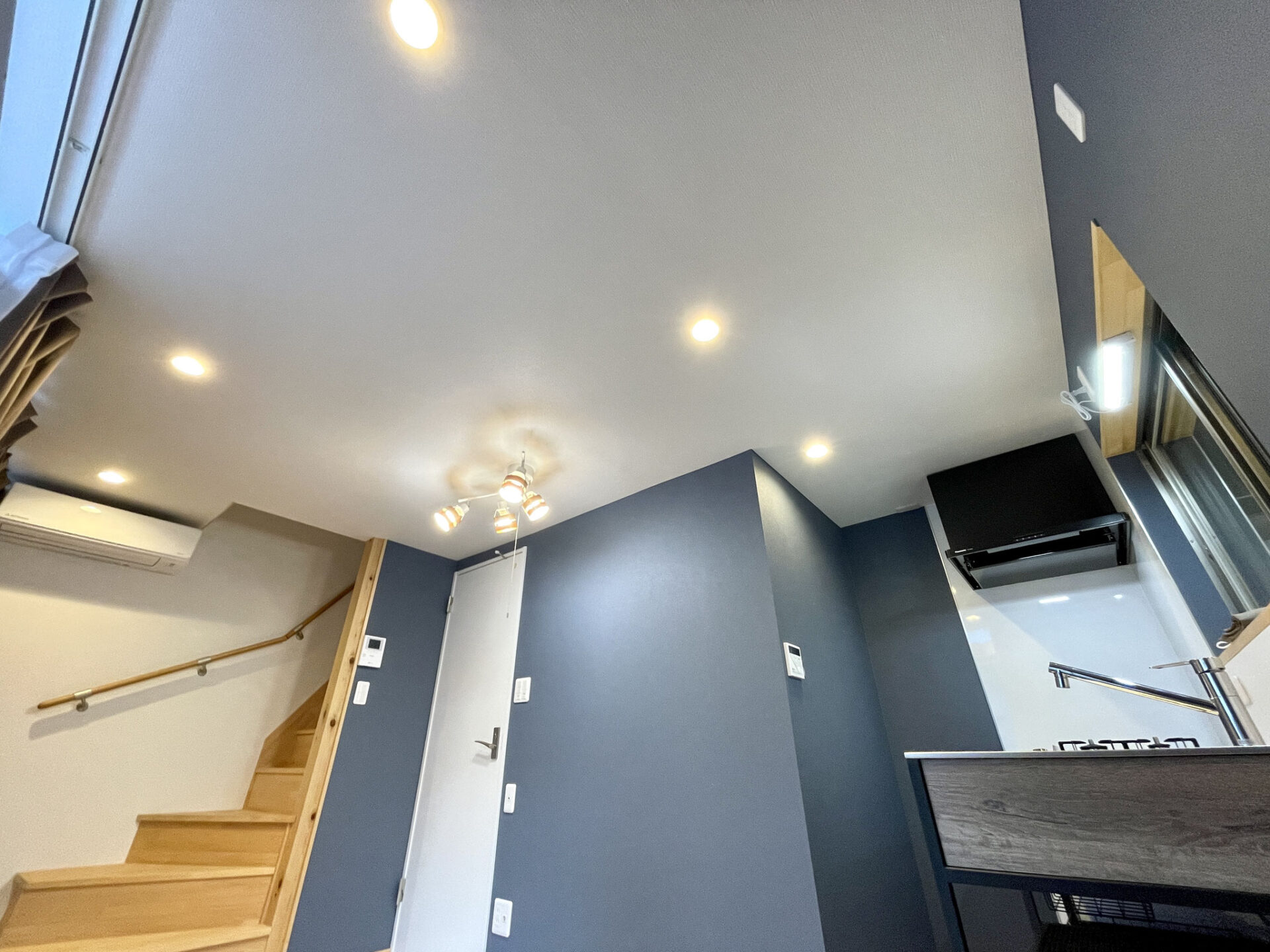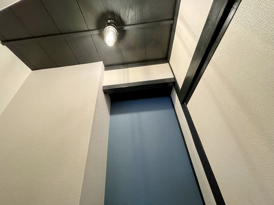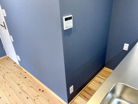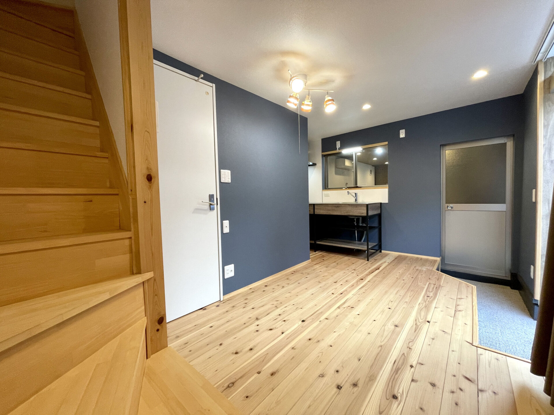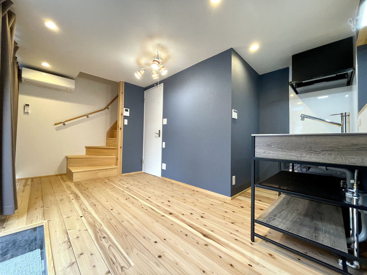 優しい色調の無垢板フローリングと紺の壁紙、暖色のライトが落ち着いた空間を創り上げています。
