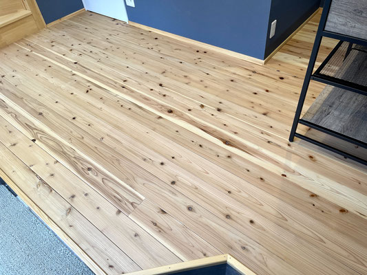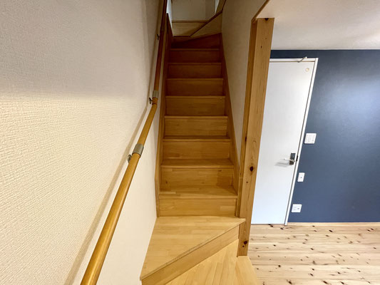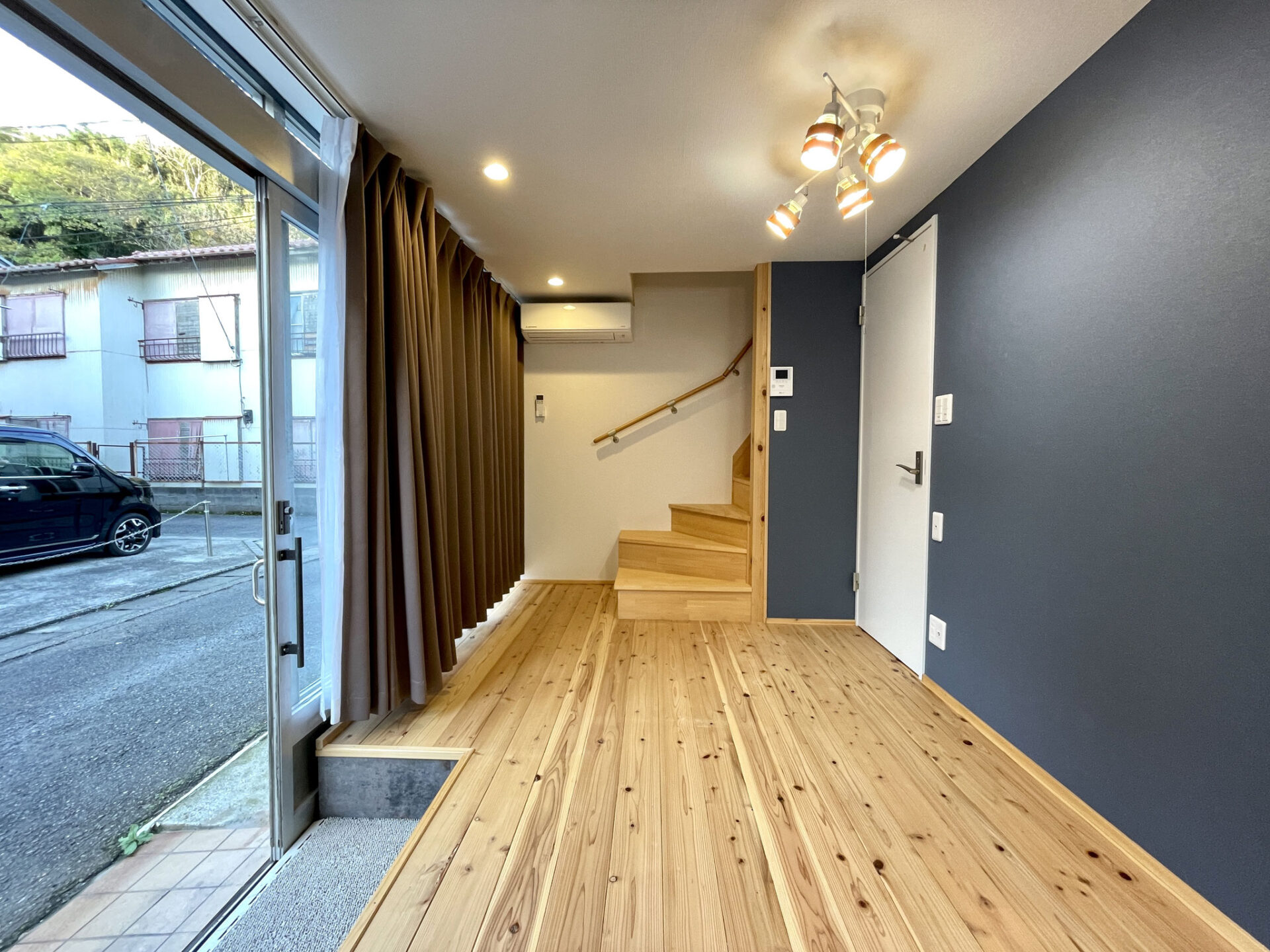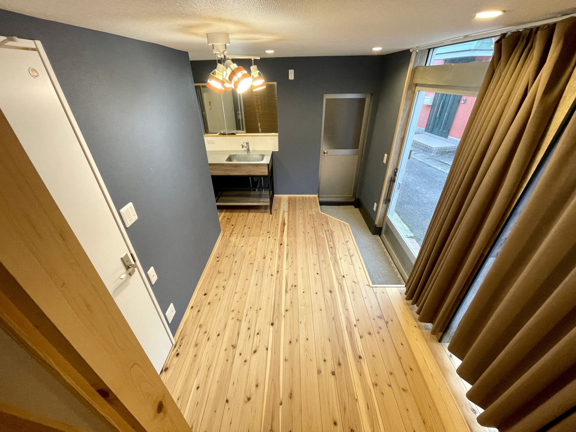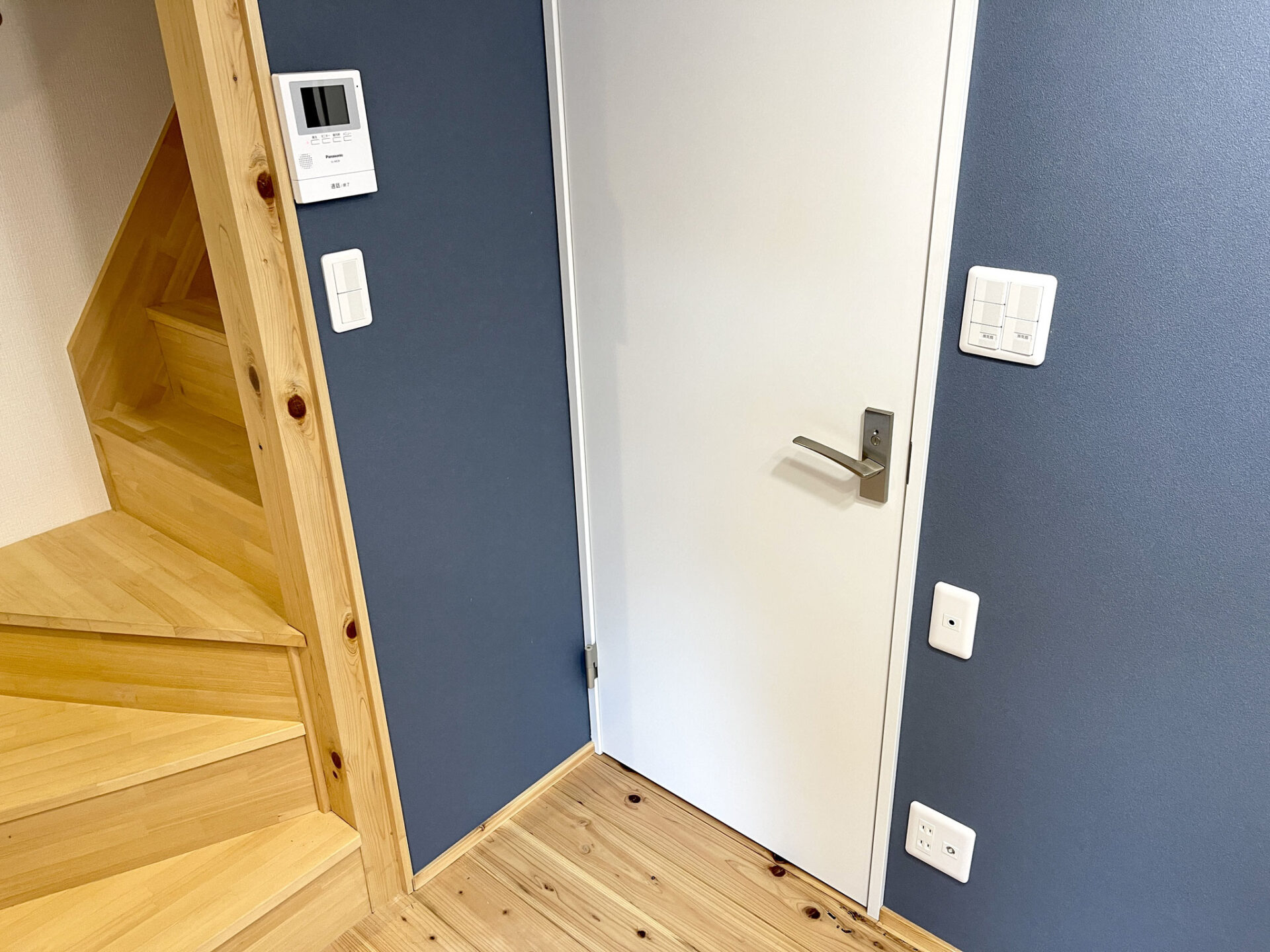 優しい色調の無垢板フローリングと紺の壁紙、暖色のライトが落ち着いた空間を創り上げています。