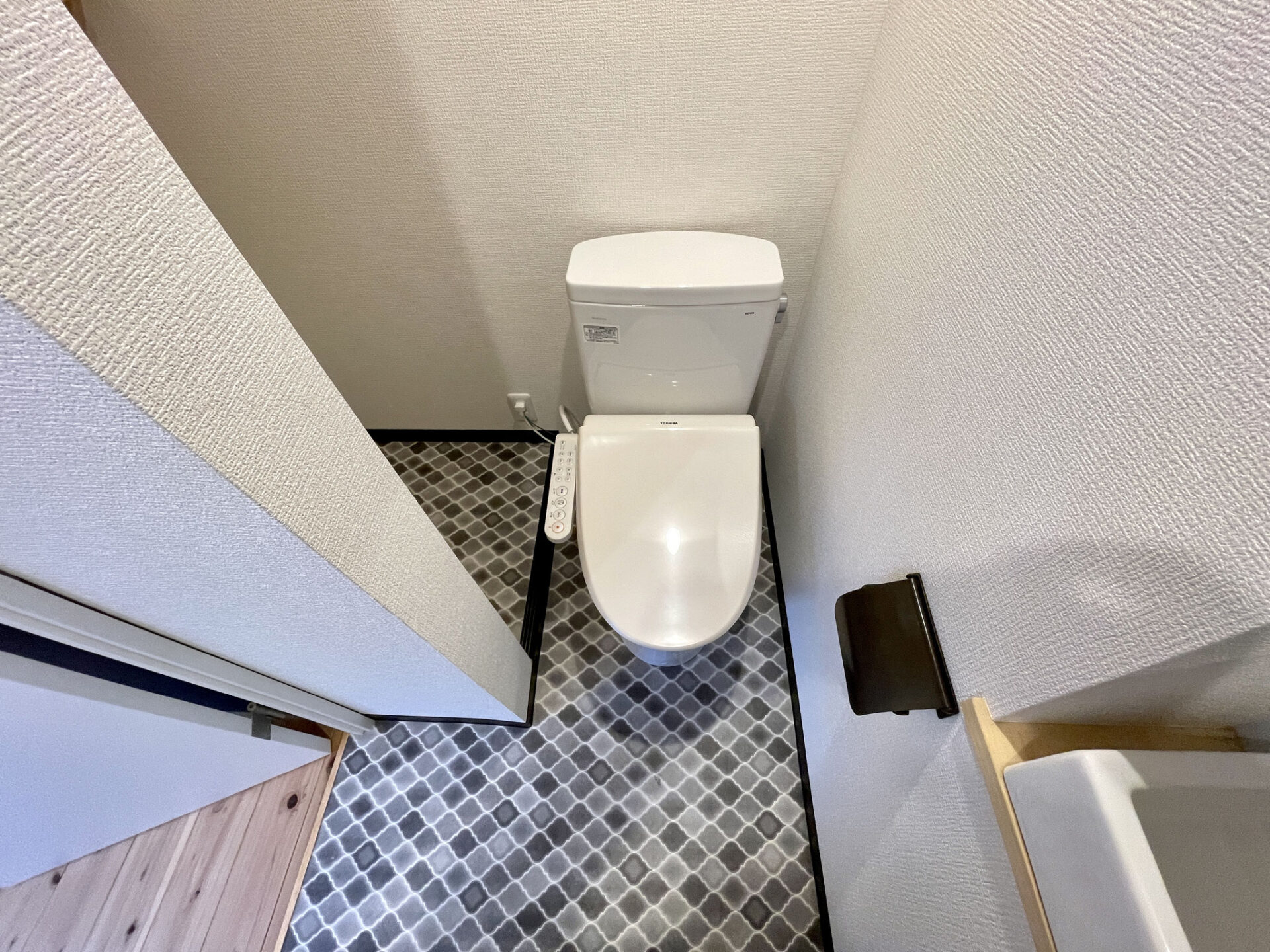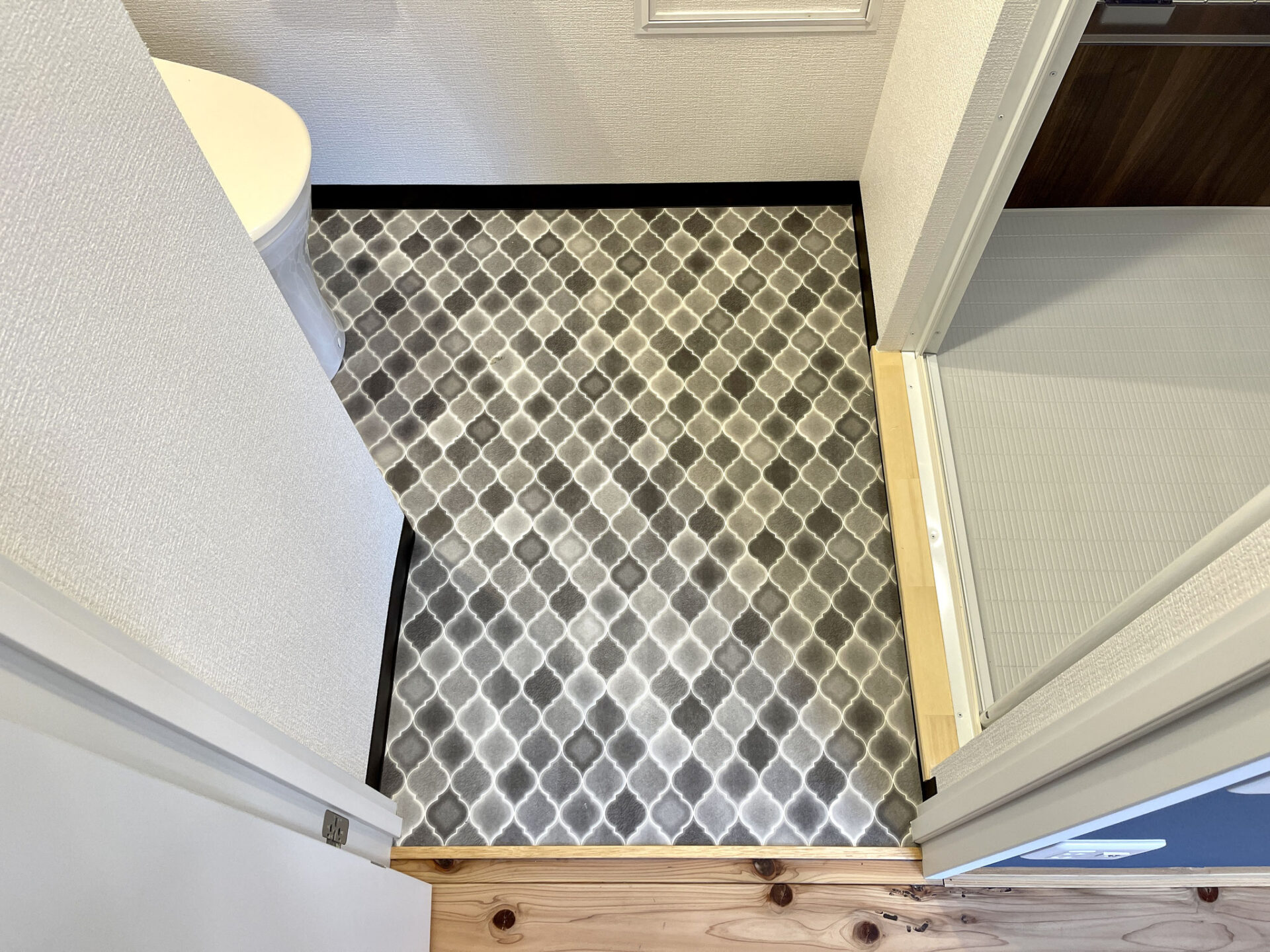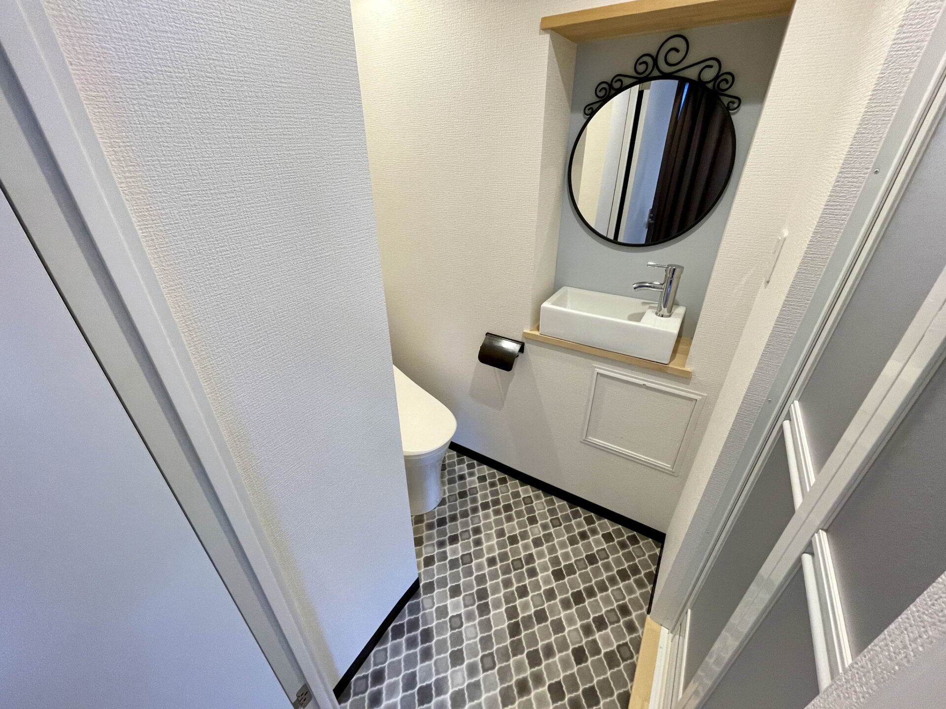 ダイニングスペースにある扉を開けるとモロカン調な床の洗面とトイレがあります。