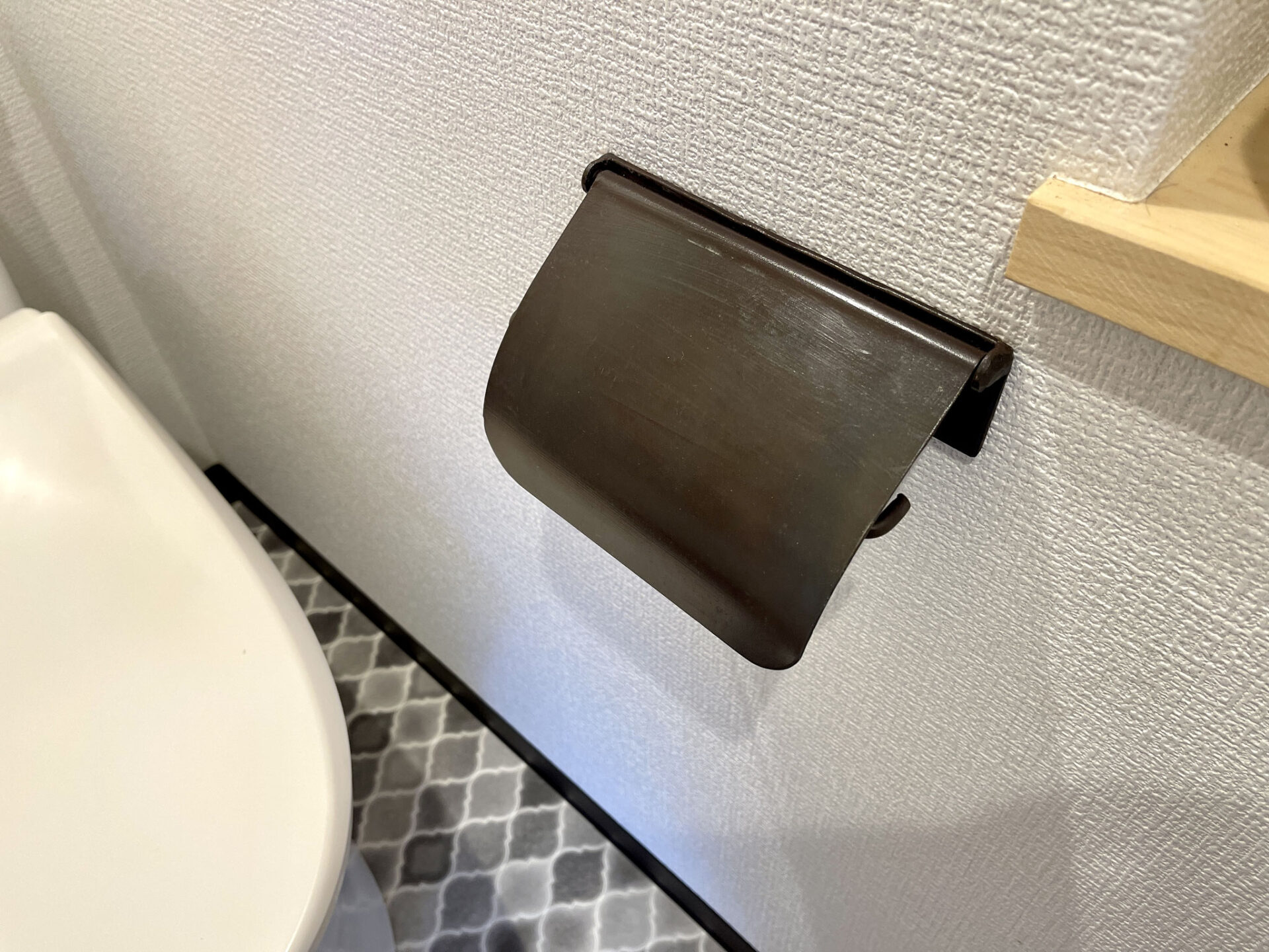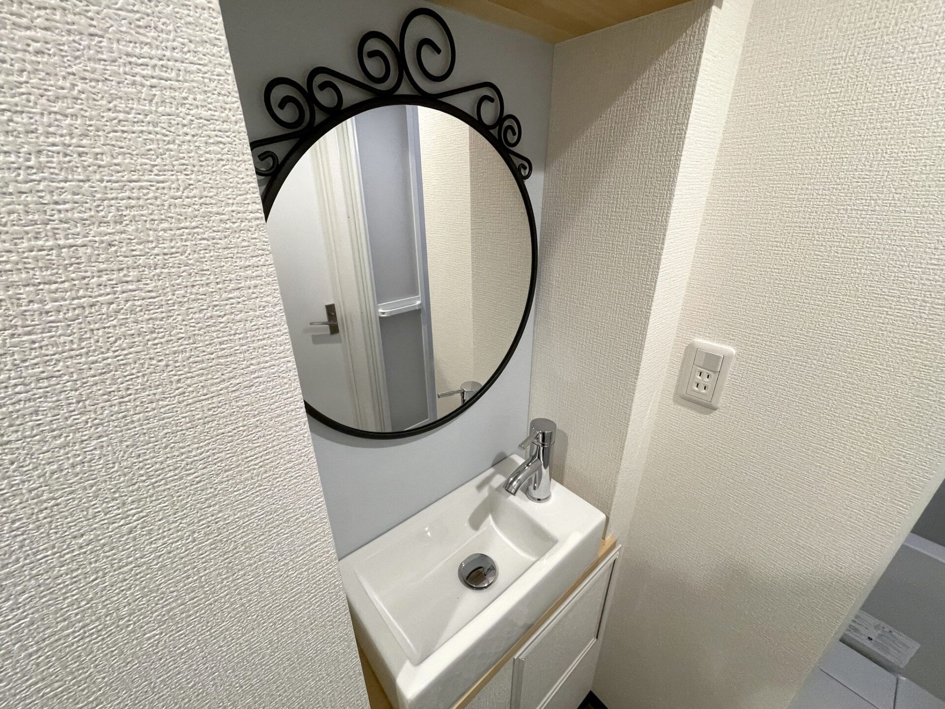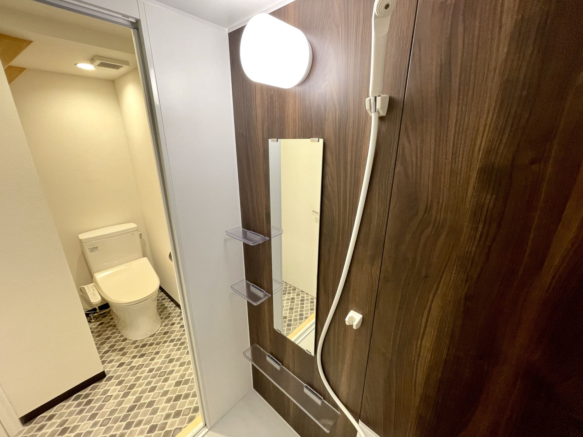 ダイニングスペースにある扉を開けるとモロカン調な床の洗面とトイレがあります。